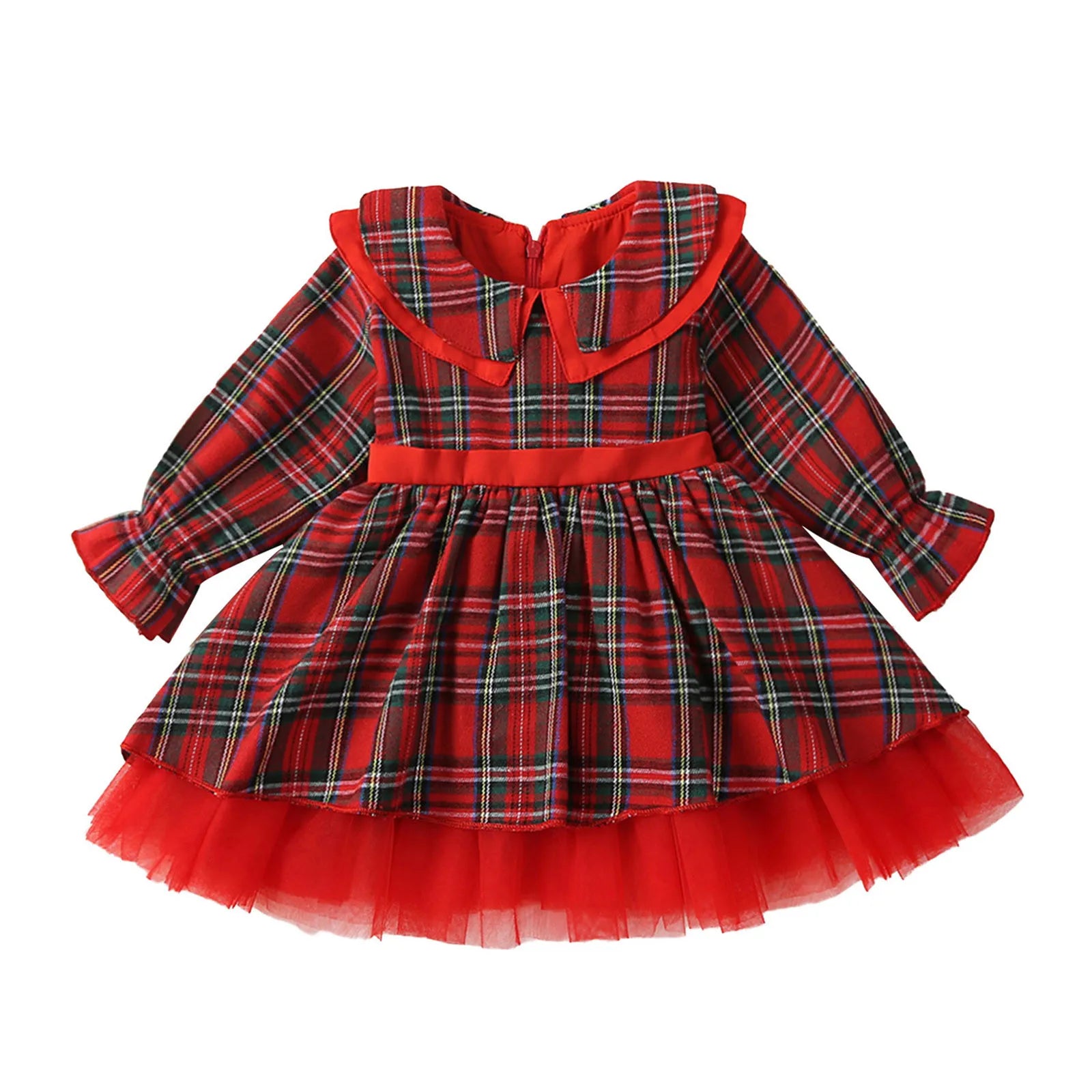 Toddler Girls Long Sleeve Christmas Plaid Prints Dress Tulle Dresses Clothes