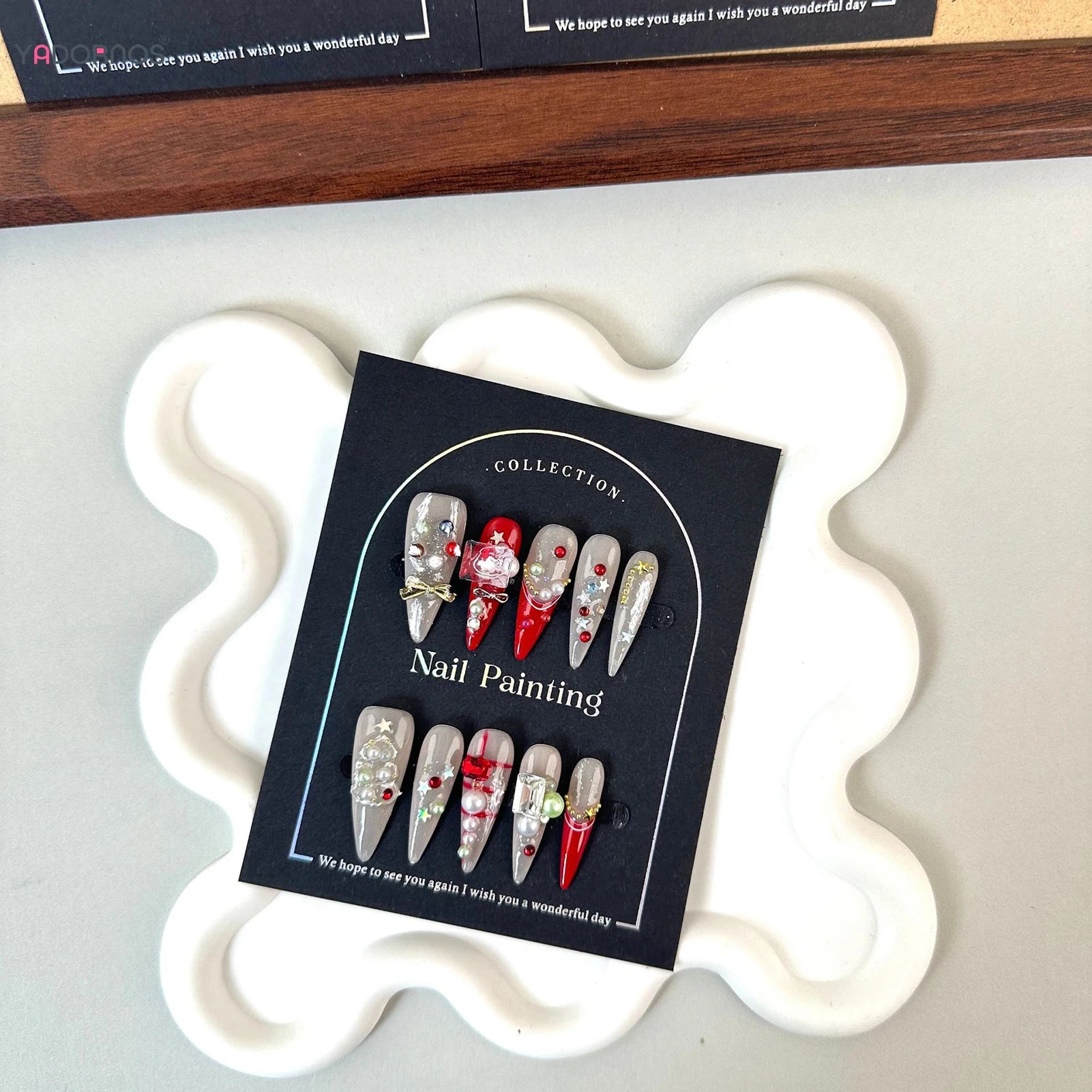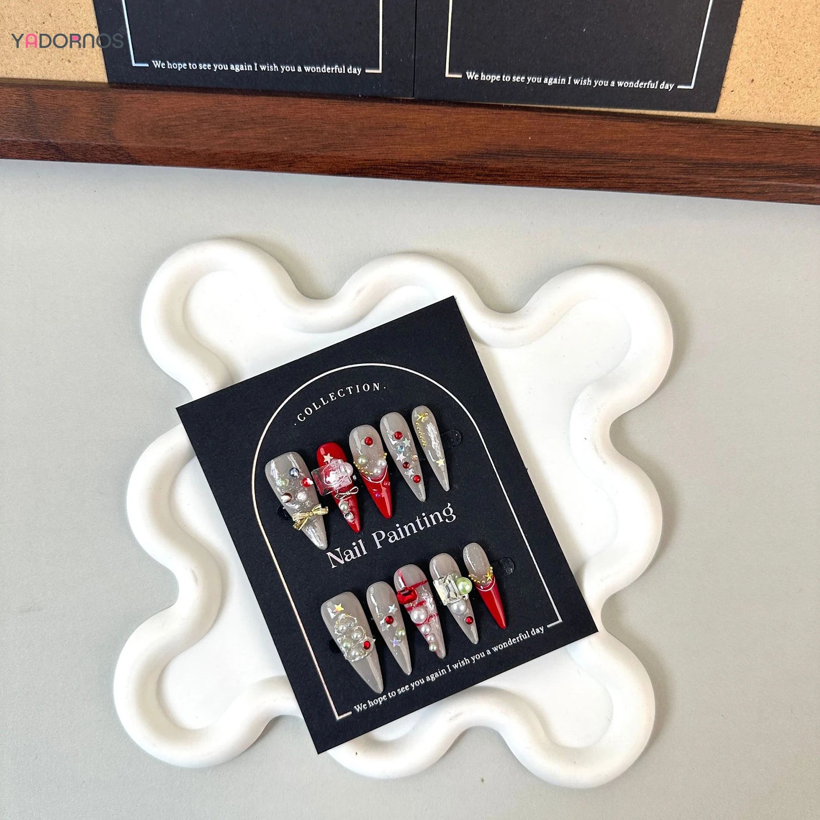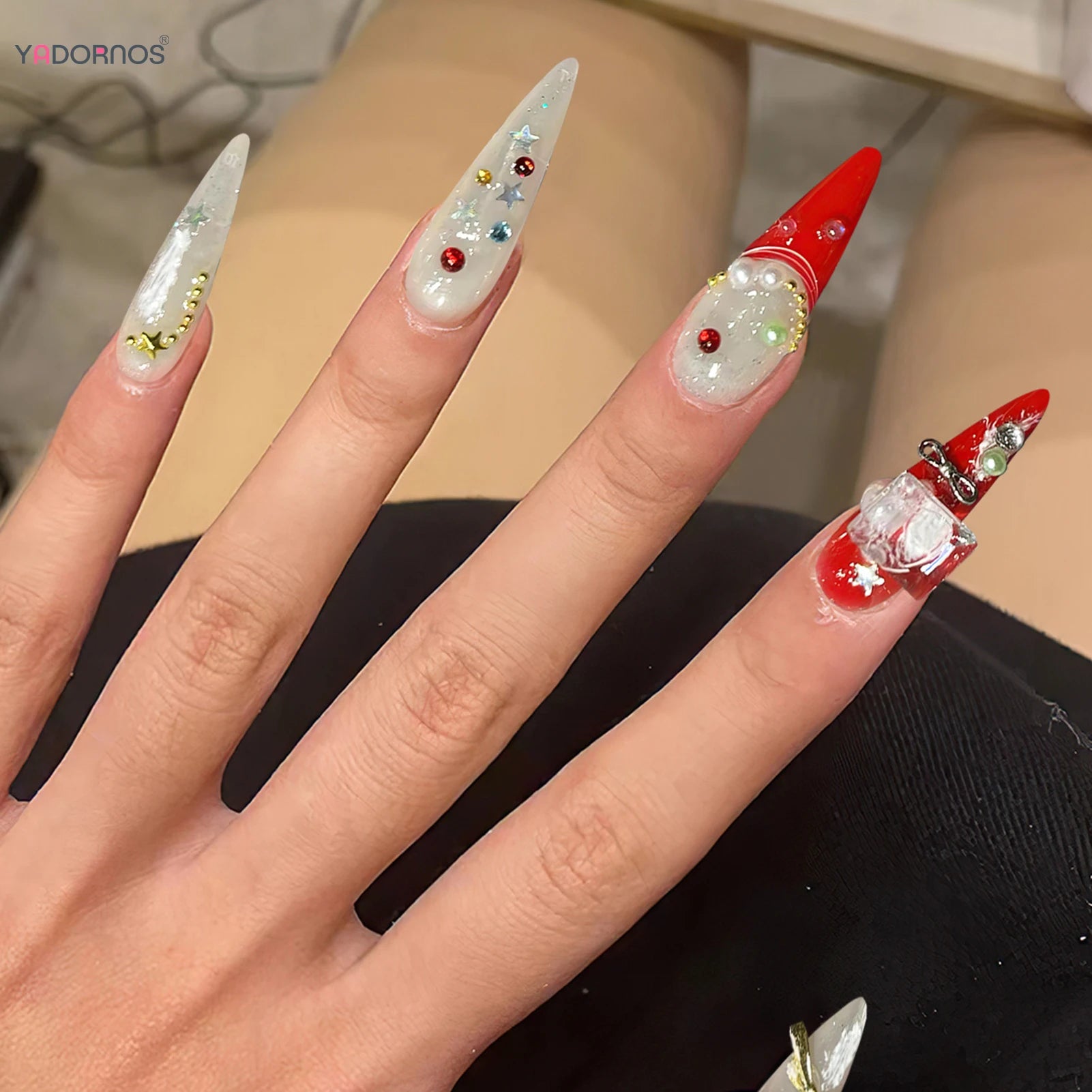 10Pcs Handmade False Nails Long Stiletto Christmas Press on Nails Red White Color Charms Star Bowknot Xmas Tree Designs Manicure