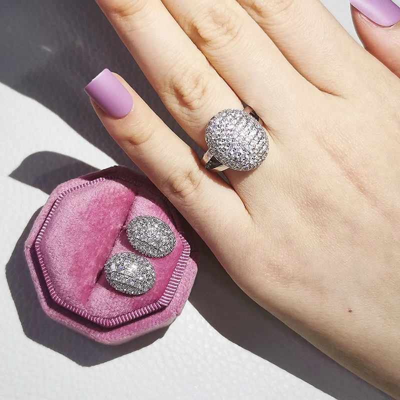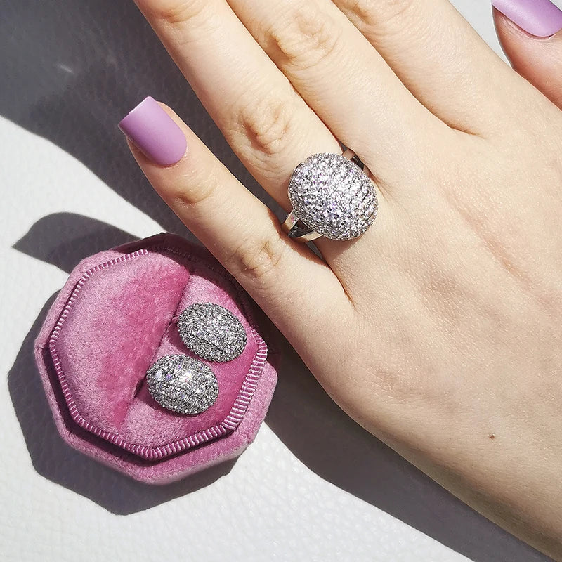 2pcs Pack silver color bride Jewelry Set Halo Engagement Ring Round Stud Earring For Wedding Christmas Gift Party J6016