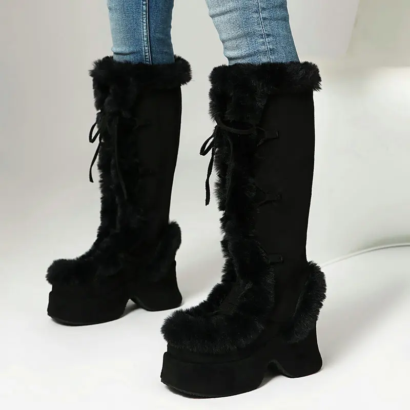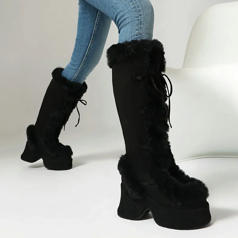 8CM Chunk Heels Winter Warm Knee High Boots Women Snow Short Plush Platform Boots Faux Fur Cosplay Lace-up Long Shoes Size 34-43
