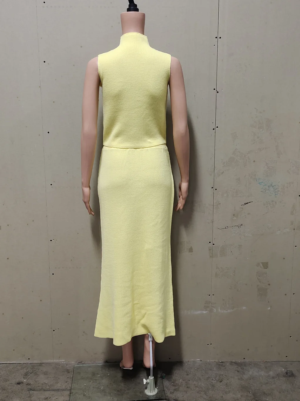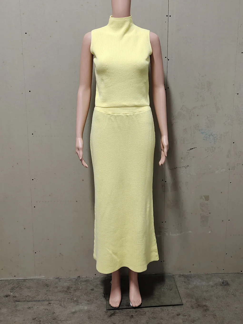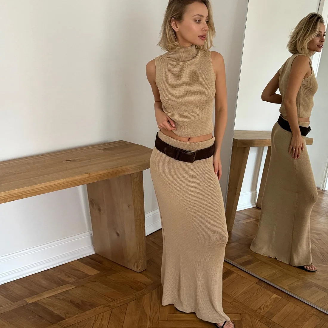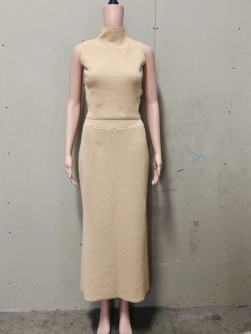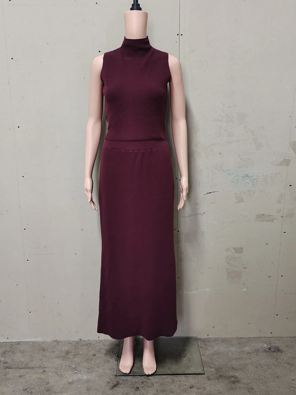 Autumn Elegant Long Skirt Two-piece Set Women's Sleeveless Knitted Turtleneck Vest Slim Skirt Set Female New Fashion Skirt Set