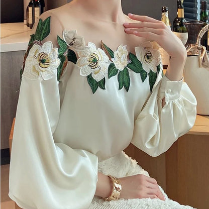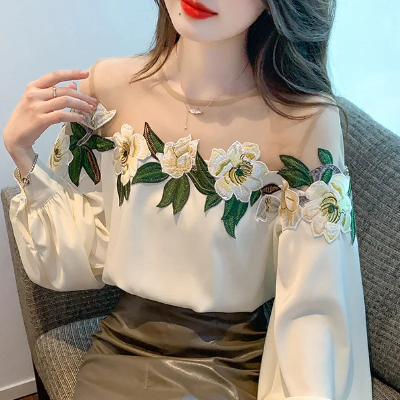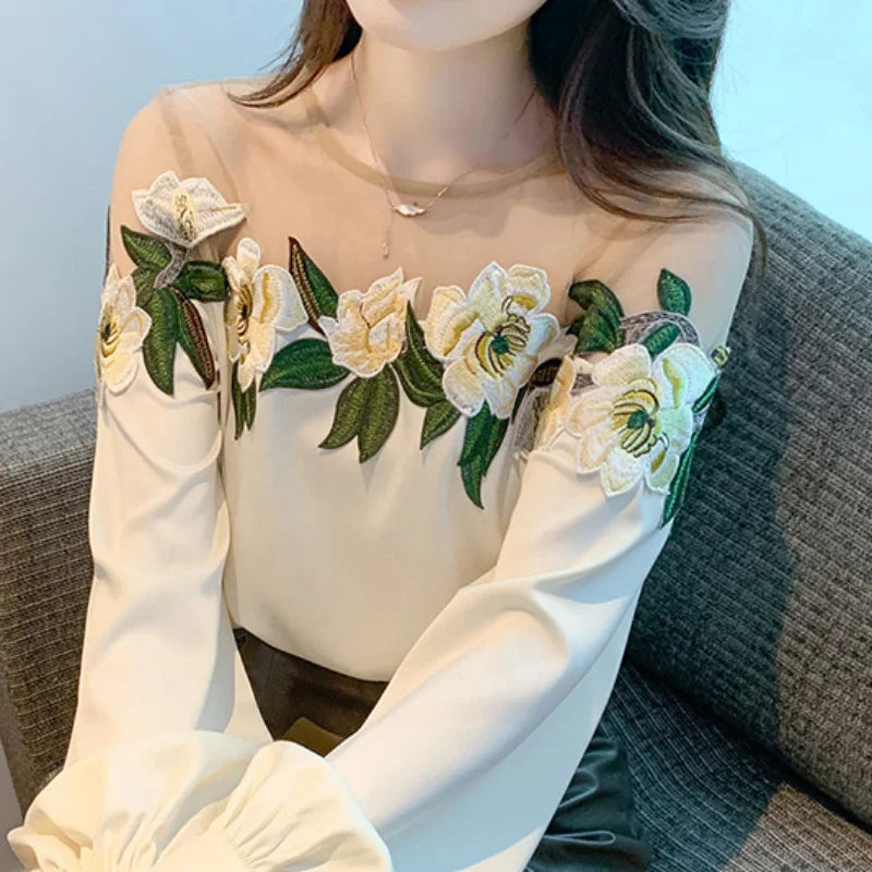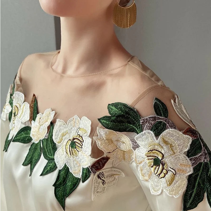 Autumn Mesh Patchwork Long Lantern Sleeve Shirt Spring Embroidered Satin Blouse O-neck Tops Women's Clothes Elegant New 24976