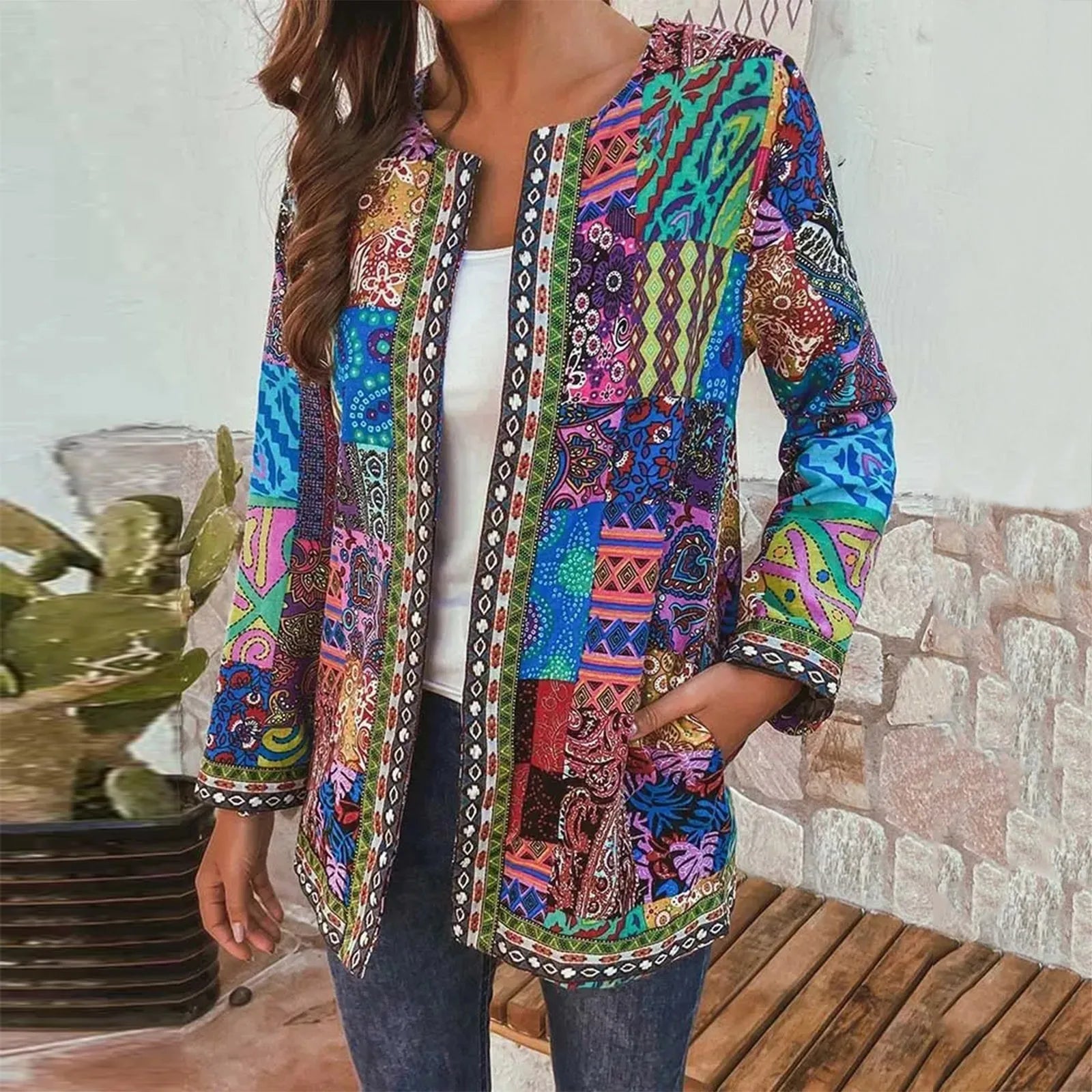 Autumn Winter Fashion Colorful Boho Floral Print Open Front Cardigan Casual Loose Long Sleeve Lightweight Jacket With Pockets