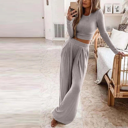 Autumn Women's Solid Knitted Casual Home Wear Slim Tops Two-Piece Wide Leg Pants Set Ladies Clothes Winter Fashion Commuter Suit