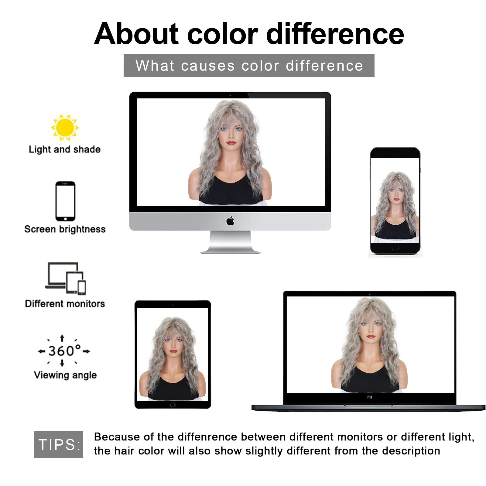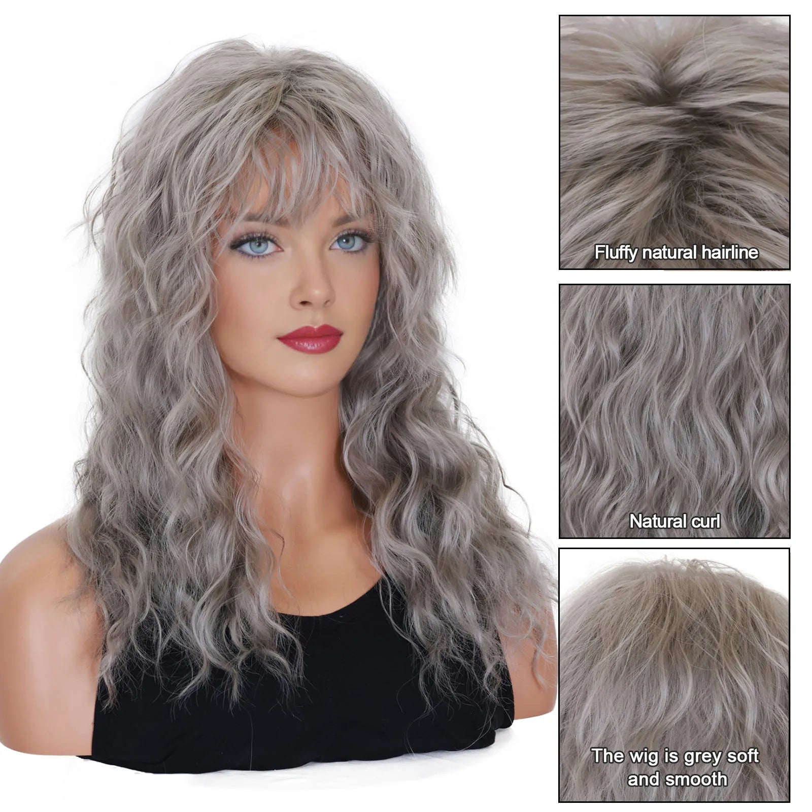 BCHR Grey Wigs with Bangs Long Curly Synthetic Wigs for Women Daily Cosplay Party Halloween Costume (Grey 20Inches)