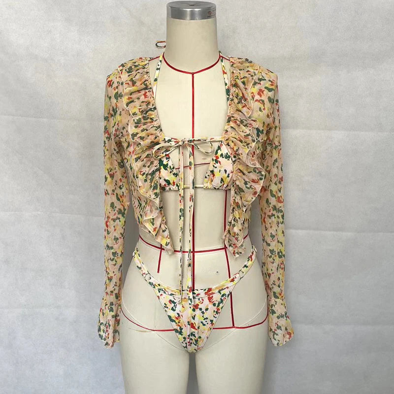 BEACHCICI Women's Bikini Three Piece Summer Sexy Retro Floral Print Long Sleeve Halter Neck Tie up Beach Vacation Swimsuit