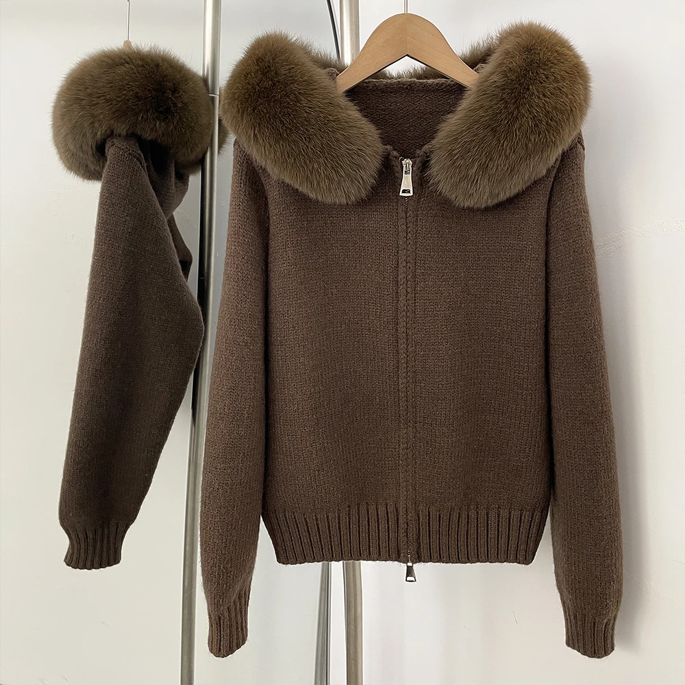 Coat Women Cardigan Natural Fox Fur Coat Women Real Mongolian Fur Knitwear Female Spring Autumn Hooded Knitted Fur Jacket