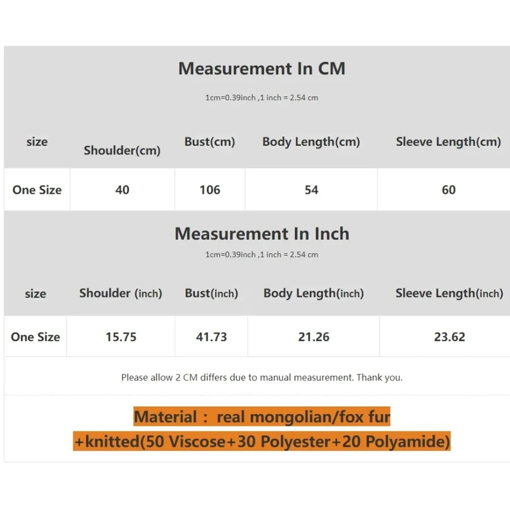 Material :real mongolian/fox fur +knitted(50 Viscose+30 Polyester+20 Polyamide) | ||||