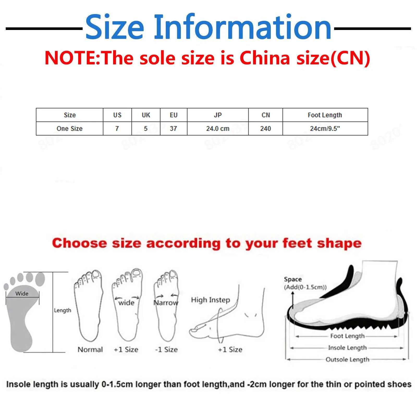 | Size:One Size | US:7 | UK:5 | EU:37 | JP:24.0 cm | CN:240 | Foot Length:24cm/9.5" |