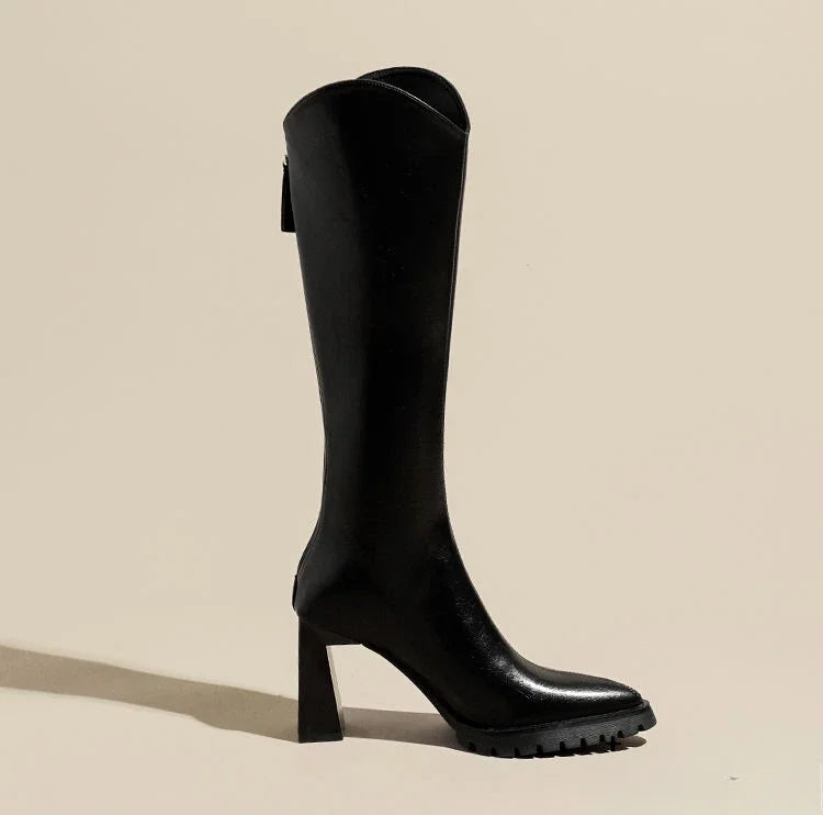 Elegant Heeled Women's Long Boots High Heels Leather Brown Ladies Knee Shaft Shoes Pointed Toe Waterproof Y2k Chic New Rock Work