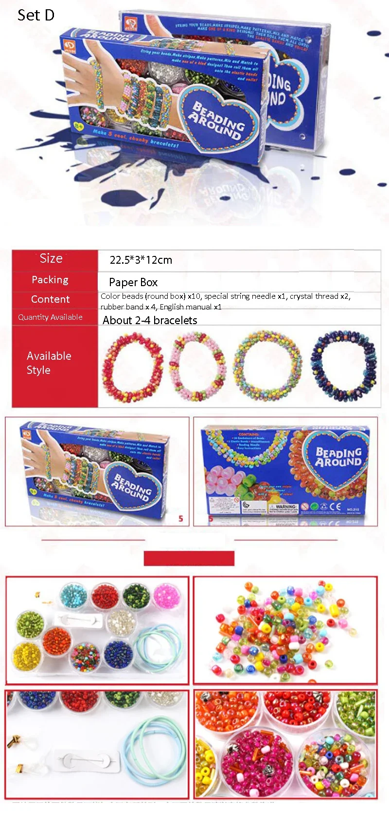 211 (Set A) & 215 (Set D) & 216 (Set E) are relatively easy to make colorful bead jewelry. 212 (Set B) & 213 (Set C) are hand rope weaving, which is slightly more difficult.
