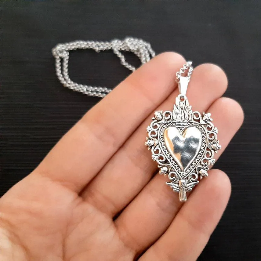 Gothic Silver Plated Heart Pendant Sacred Heart Necklace Halloween Wedding Party...