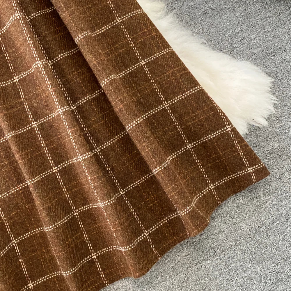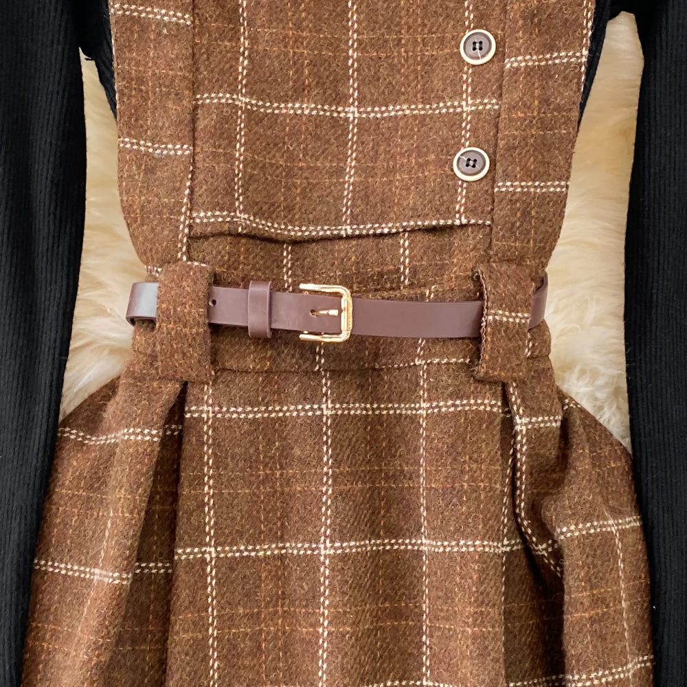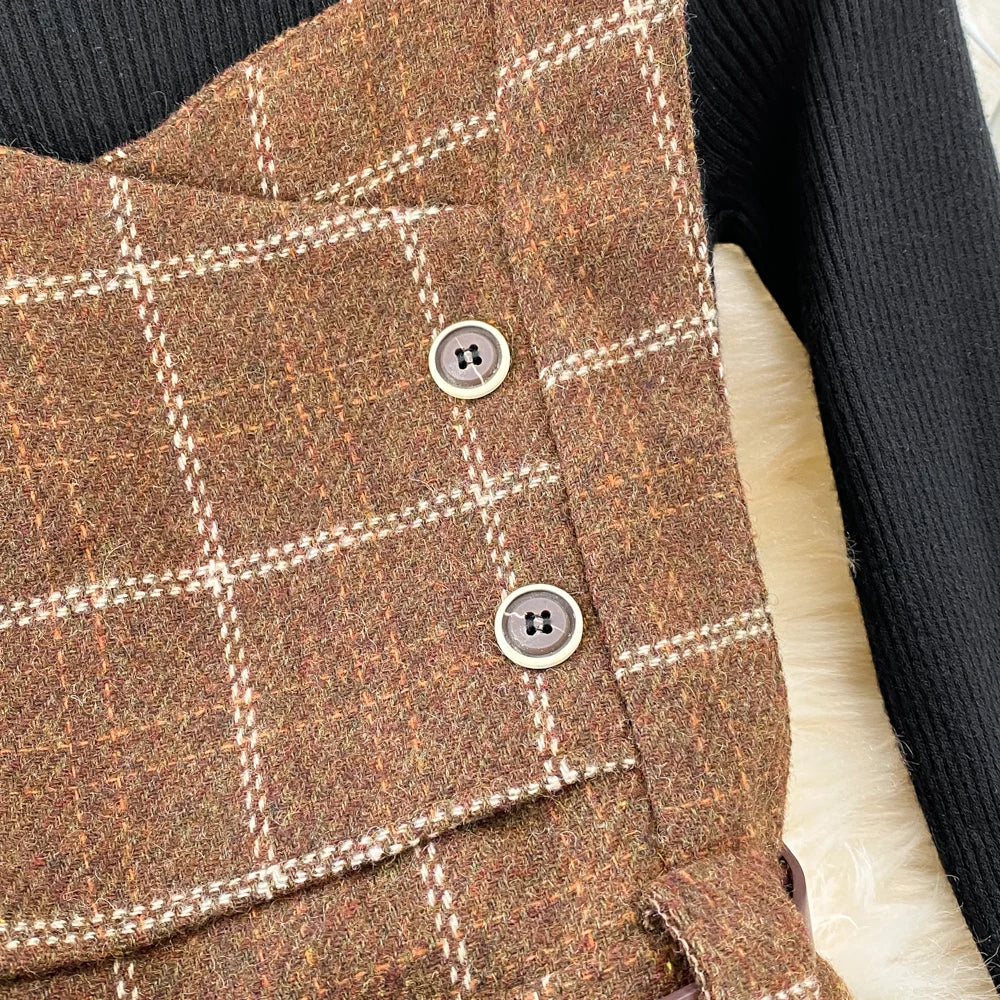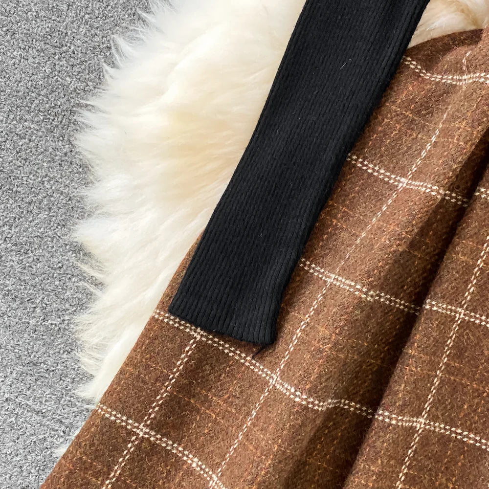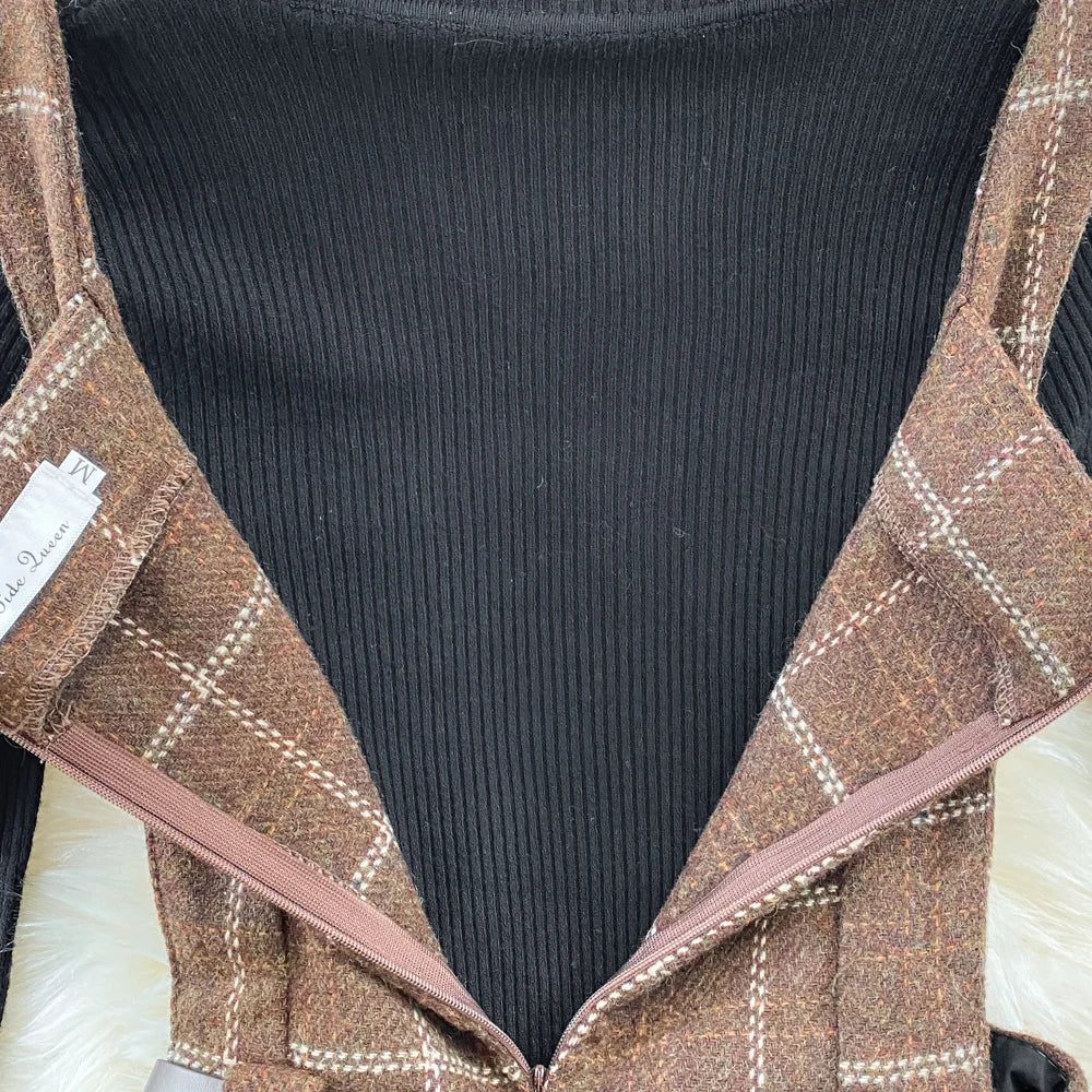 High Quality Fall Winter Women Sweater Overalls Dress Sets Casual Knitted Tops +Plaid Woolen Dress 2 Piece Sets Outfits Female