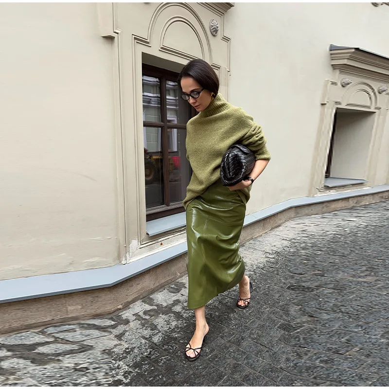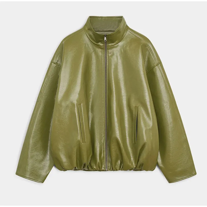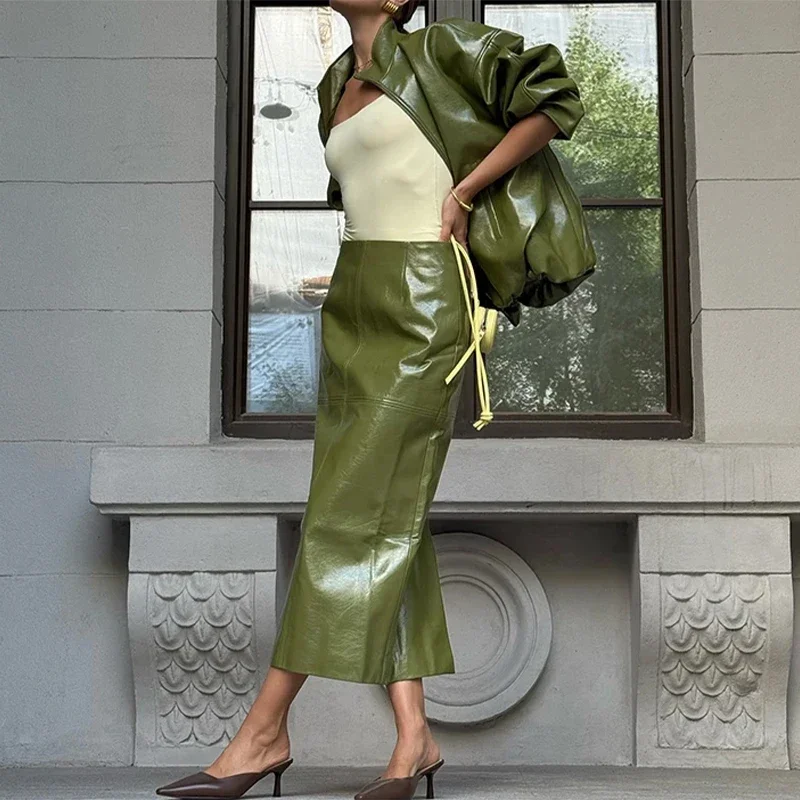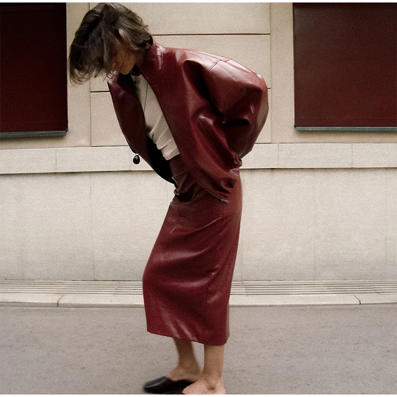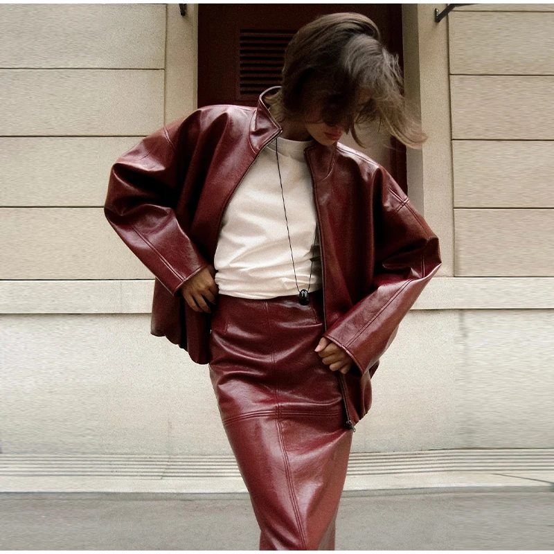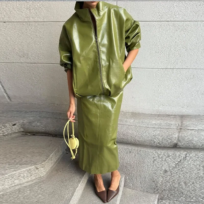 Leather Fashion Jacket Skirt Sets Women Zipper Loose Street Stand Collar Coats Straight Midi Skirts Suits 2025 Autumn Party Chic