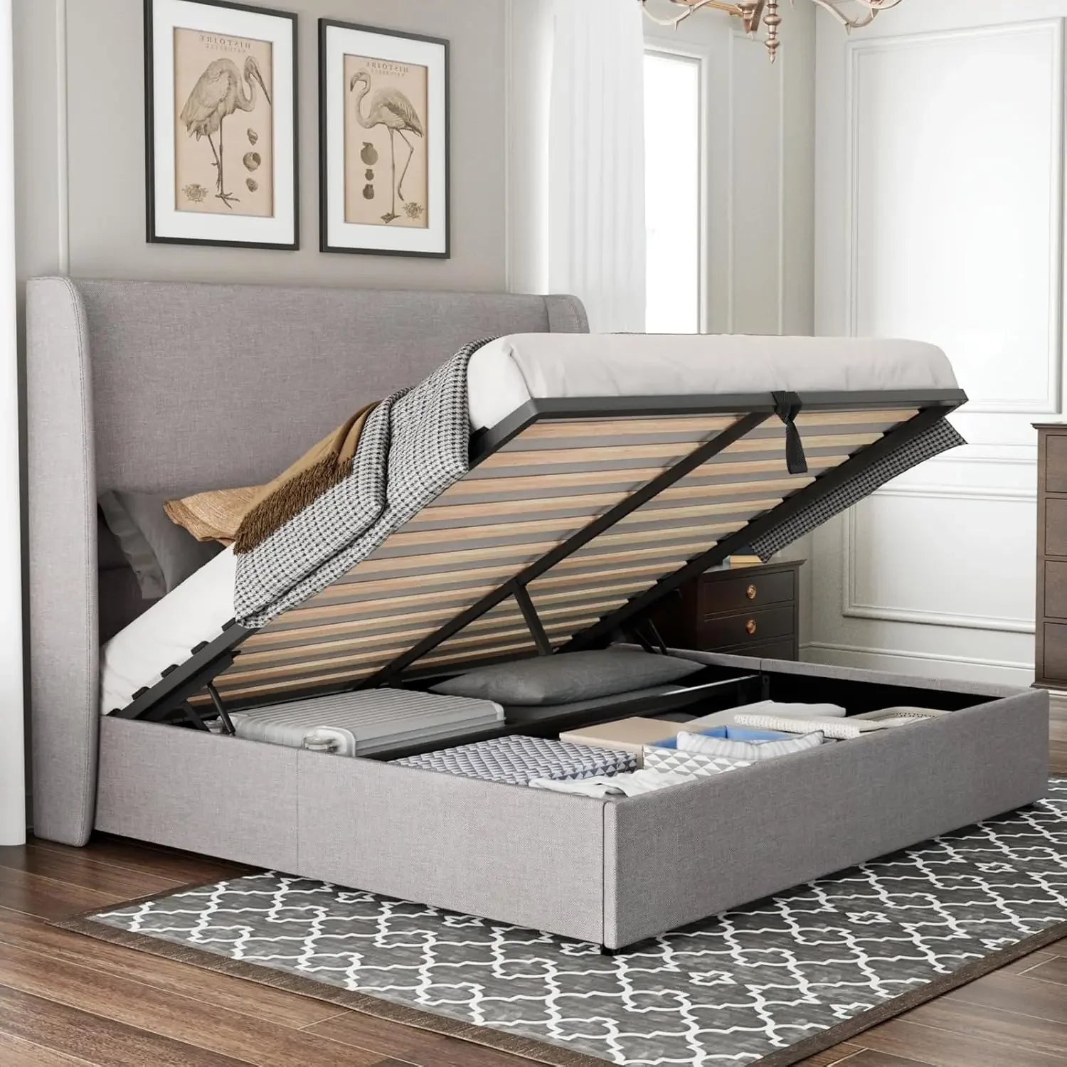 Lift Up Storage Bed Linen Upholstered Platform Bed Frame/Hydraulic Storage/Modern Wingback Headboard/No Box Spring Needed