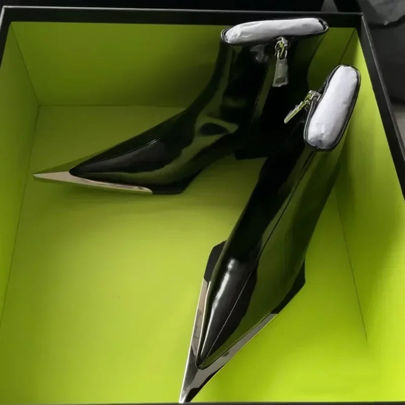 Luxury Designer Pointed Toe Chelsea Boots Women 2025 Fall Chunky Heel Metal Toe Decoration High Heels Side Zip Black Ankle Boots