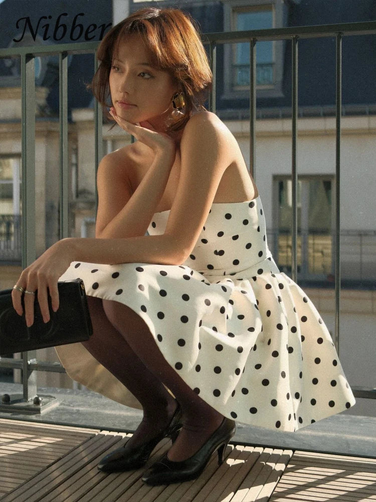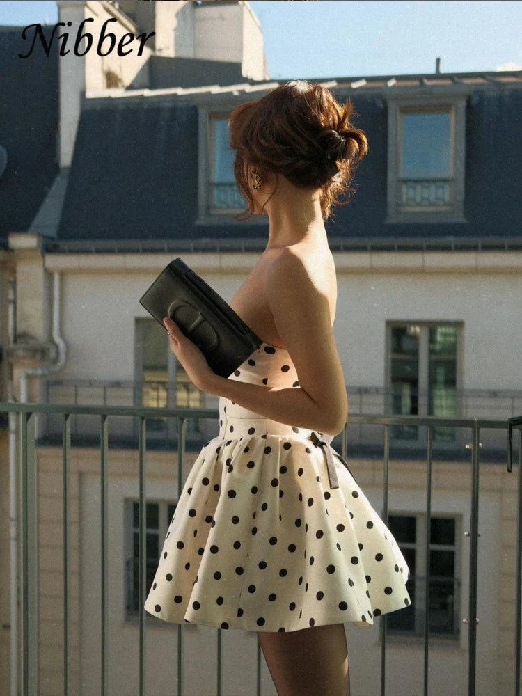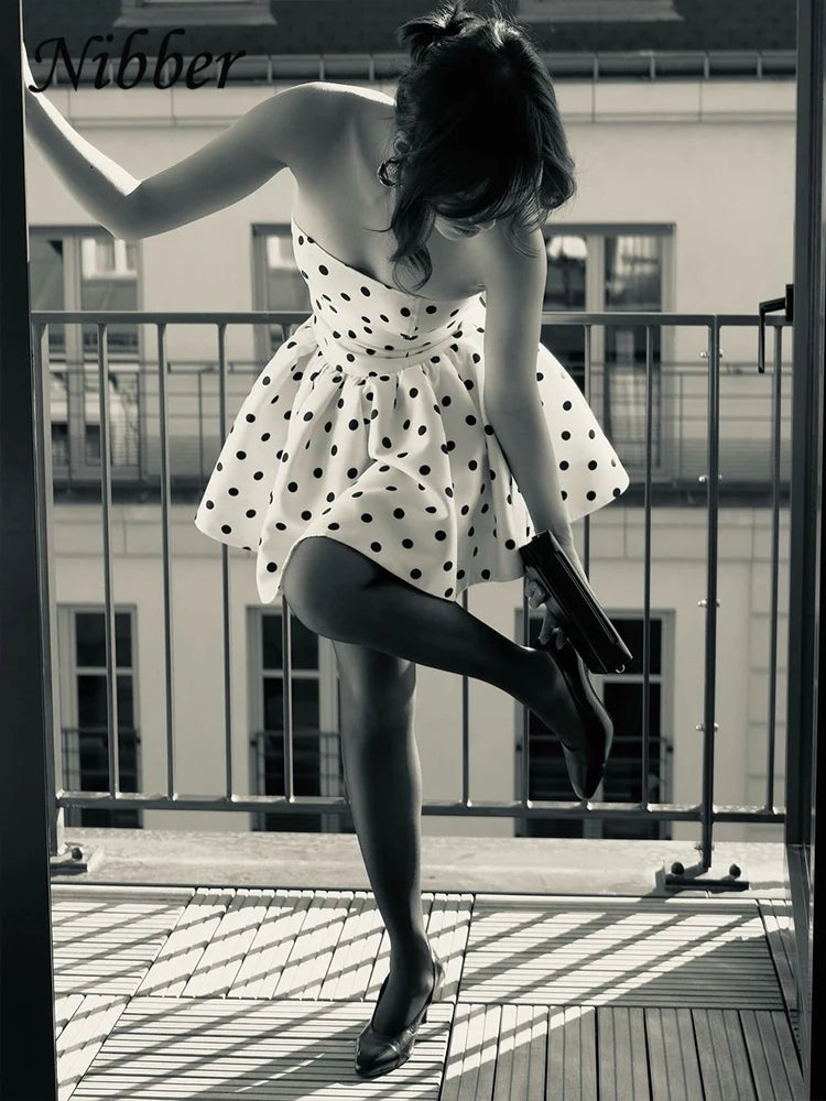 Nibber Dots Print Dress Women Chest Wrap Backless Bow Applique Ruffles Loose Hem 2025 Y2k Trend Streetwear Chic Mini Bodycon