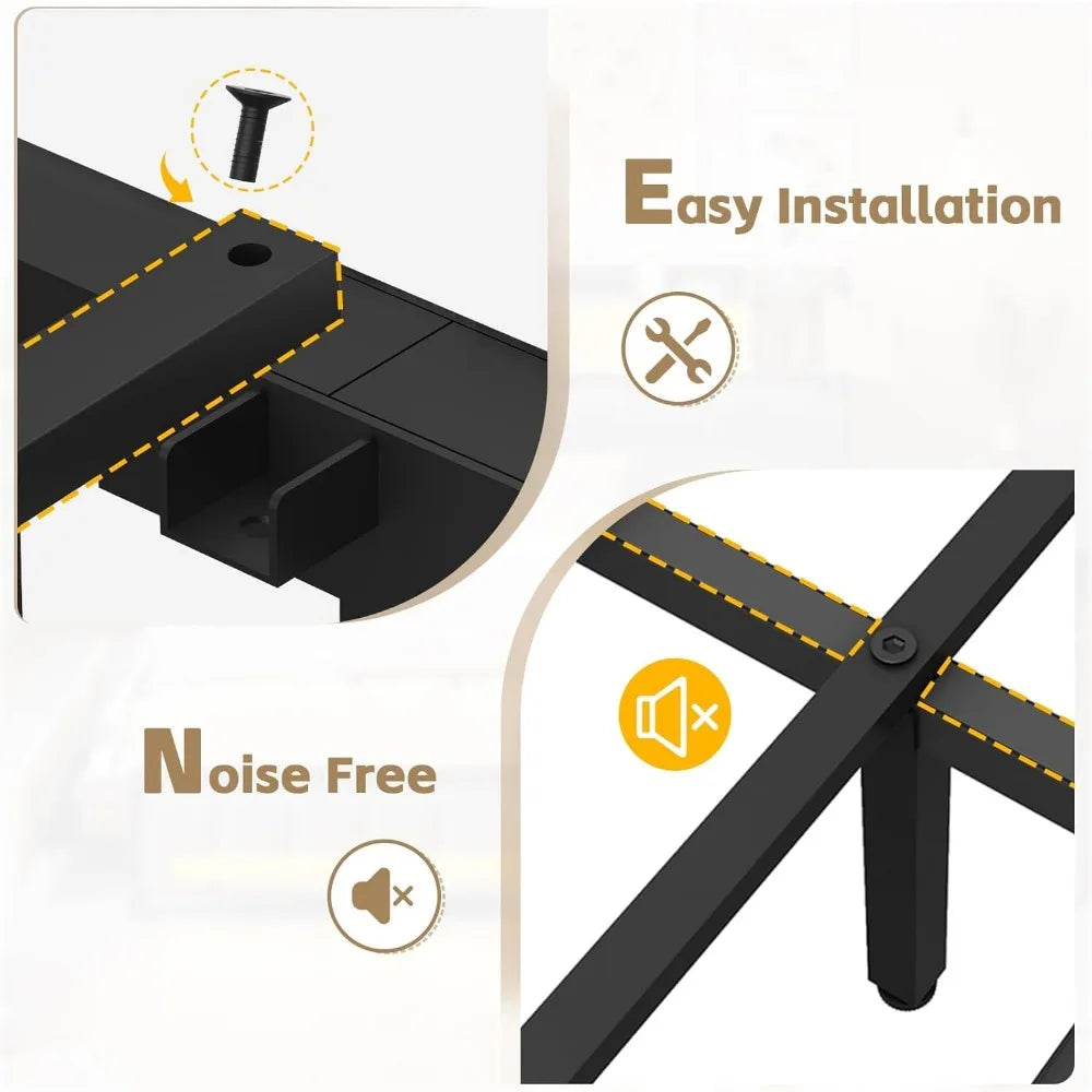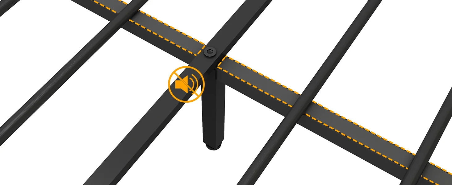 - 【Solid Construction & Noise Free Design】-The bed frame consists of 13 heavy-duty metal slats and 11 metal legs (5 central supporting adjustable legs) that do not require a box spring and can hold up to 1100 lbs. EVA sound absorbing strips under the center bar prevent metal-on-metal noise, creating a noise-free, distraction-free sleep environment.