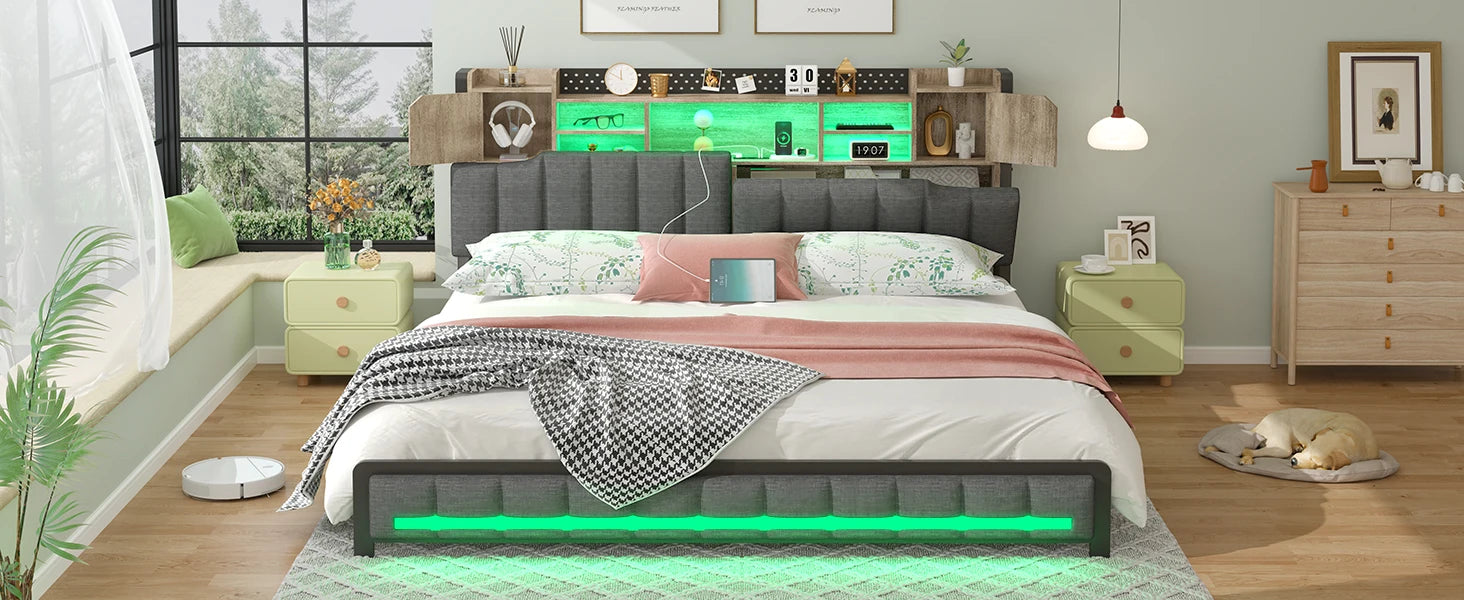 Queen Bed Frame with Storage Bookcase Headboard & LED Lights,Upholstered Bed Frame with USBCharging Station,No Box Spring Needed