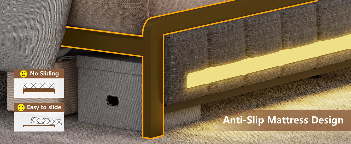 - 【Bed Frame with Smart RGB LED Lights】- This Queen bed frame supports the headboard and footboard RGB LED light. Controlled by Remote/APP, the metal bed with beautiful Multi-colour RGB LED light strips(There are over 60000 colors to choose from), you can freely set the brightness,color,mode and timing function. Music Sync mode makes your LED lights flash to the rhythm for an immersive home concert experience.