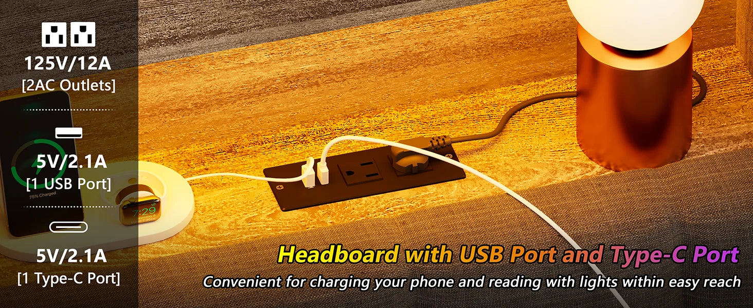 - 【Convenient Charging】 - Built-in charging station for queen-size bed frame headboard, includes 2 AC outlets & 1 USB port and 1 Type-C port, which is convenient for you to charge your phone within reach or read easily while lying in bed with a book light.