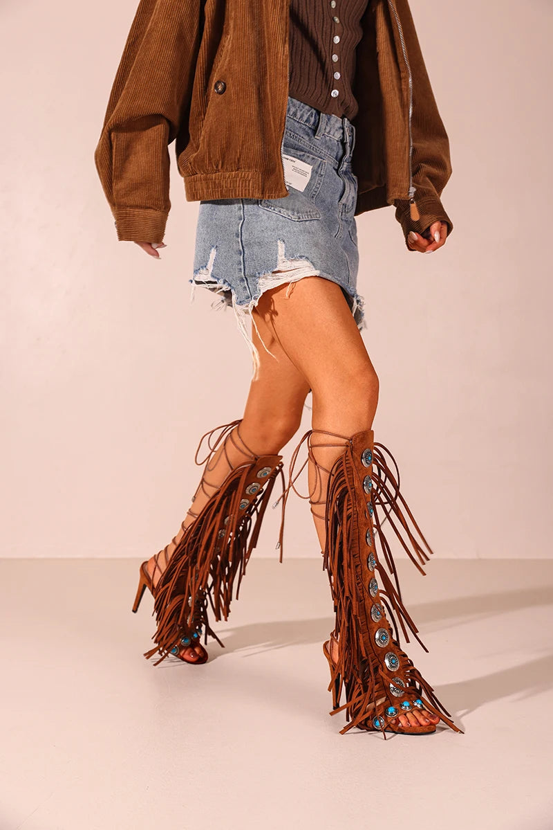 Real cow suede leather tassels women sandals peep toe jewel lace up 10cm high heels