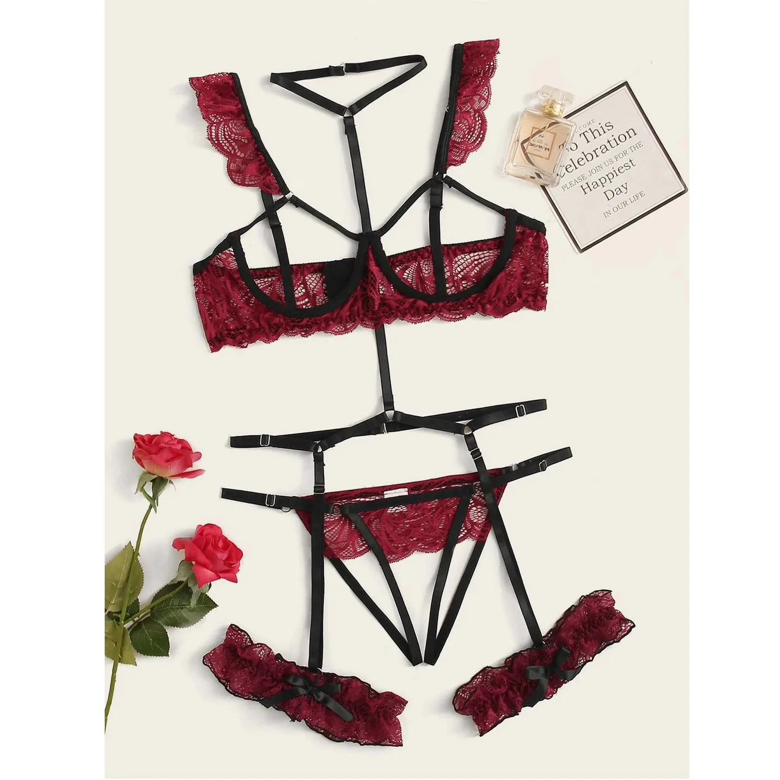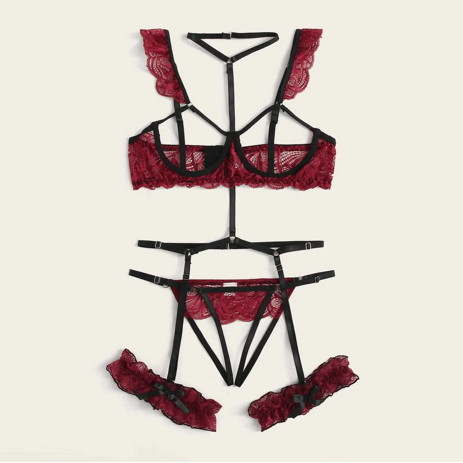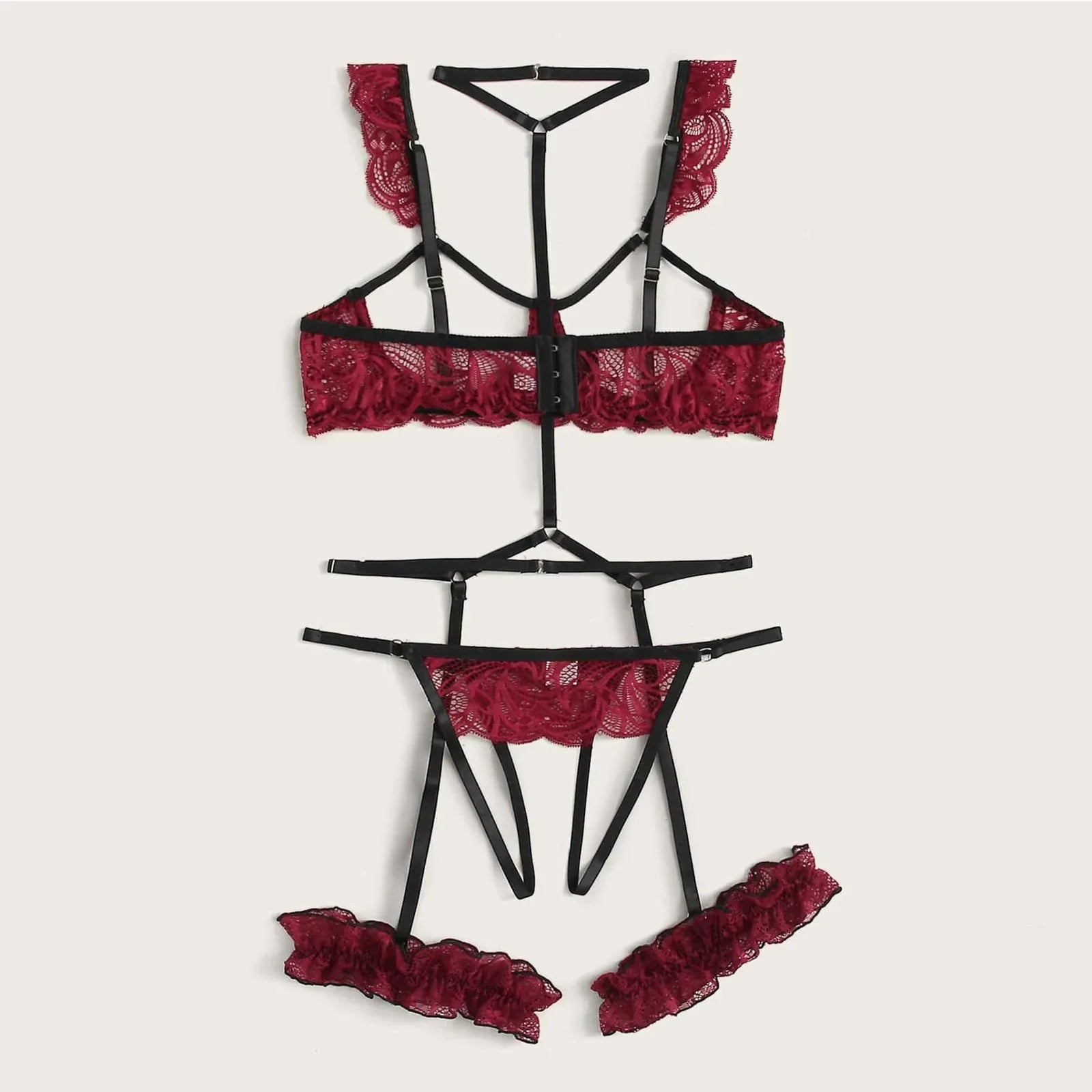 Sexy Lace Crotch Lingerie Set Halter Choker Hollow Bra Underwear Bandage Sleepwear Steel Ring Pajamas Garter Lingeries Sets Sexy