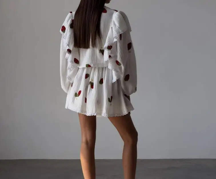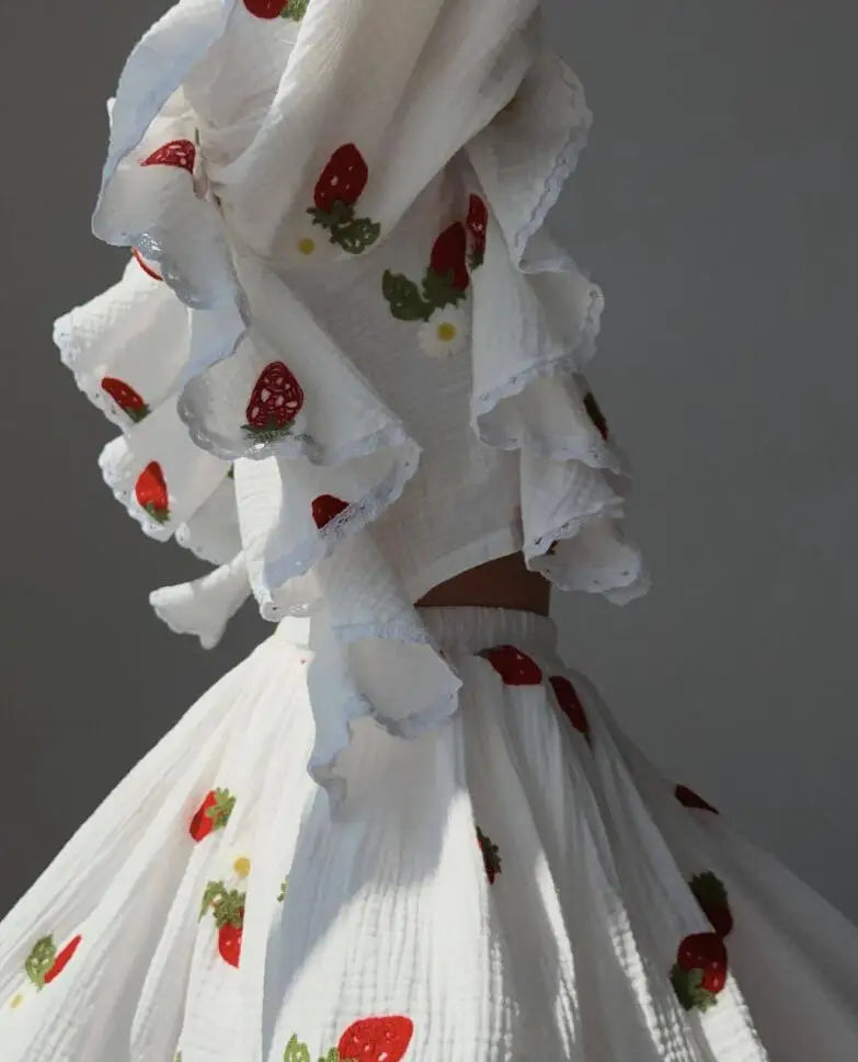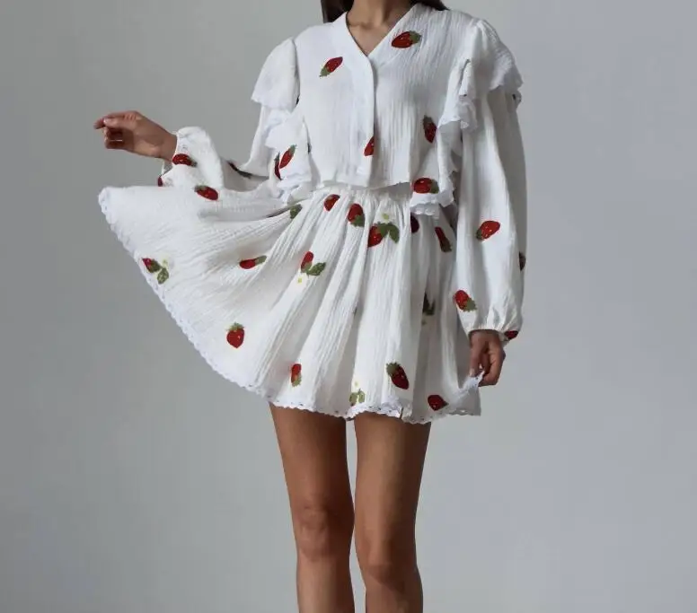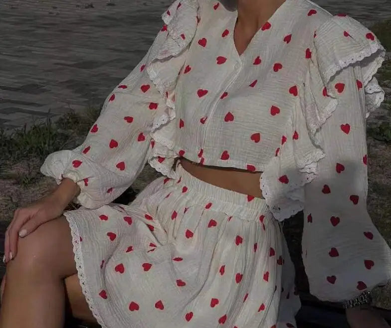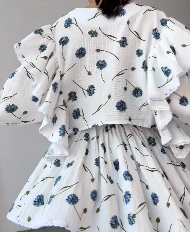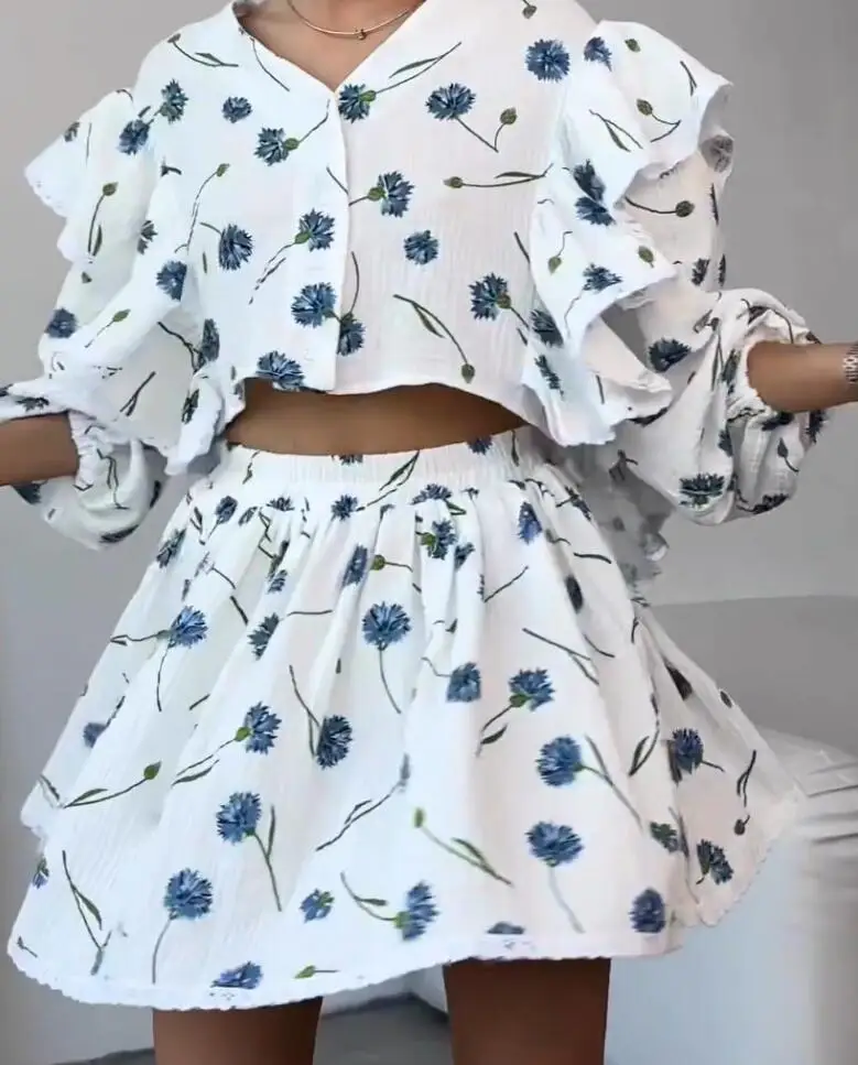 Spring And Summer New Fashion Ruffle Edge Long Sleeved Printed Shirt + Elastic Waist Short Skirt Set For Women,4 Colors