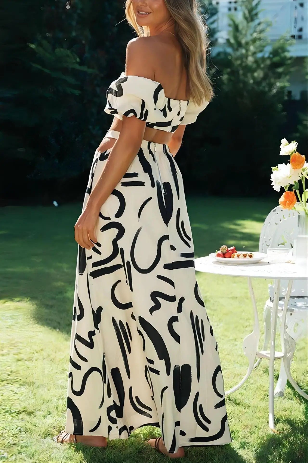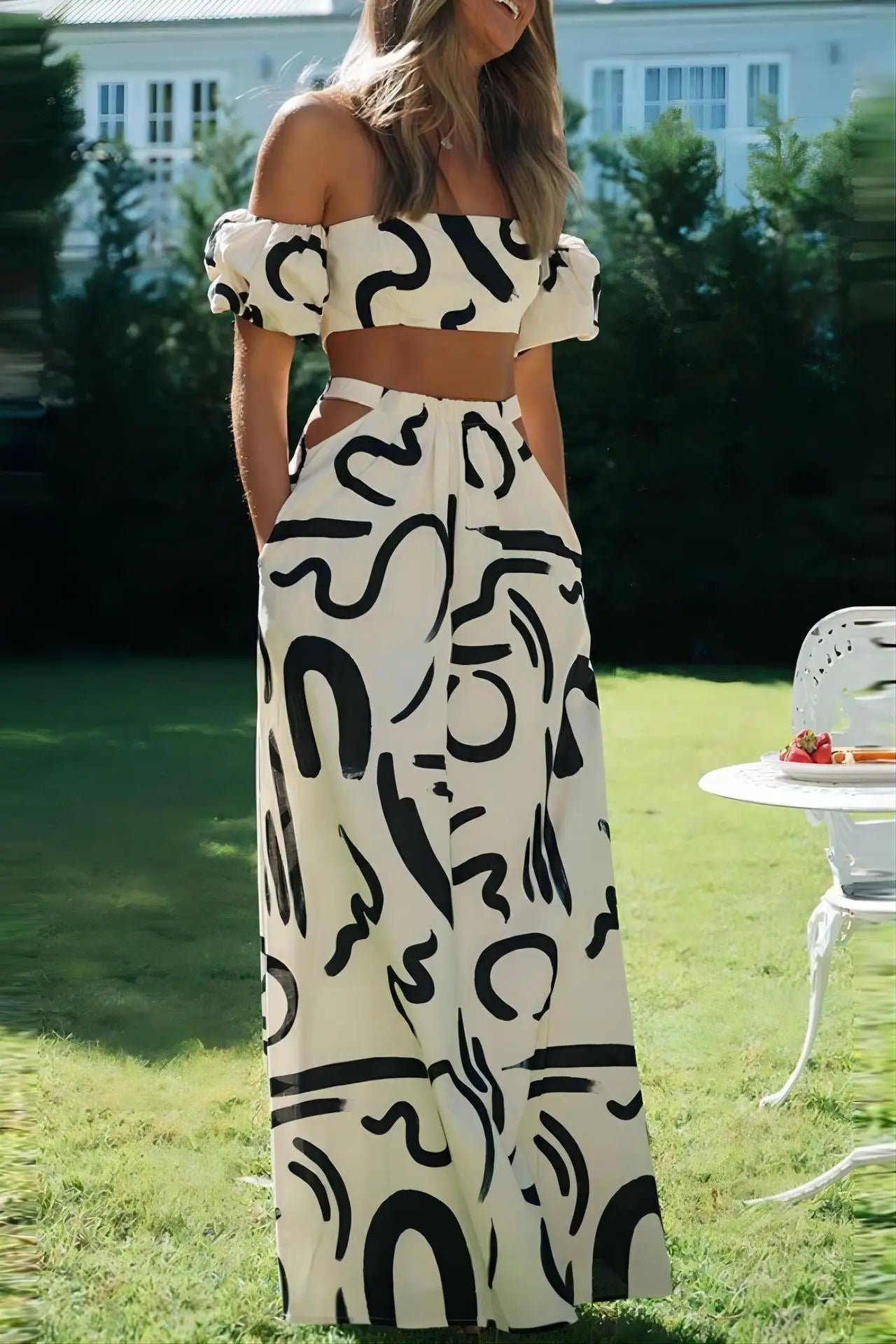 Two Piece Sets Fashion New Print Solid Color Puff Sleeve Zipper Breast Wrap Crop Top & Hollow Out Waist Big Hem Dress Suits Lady