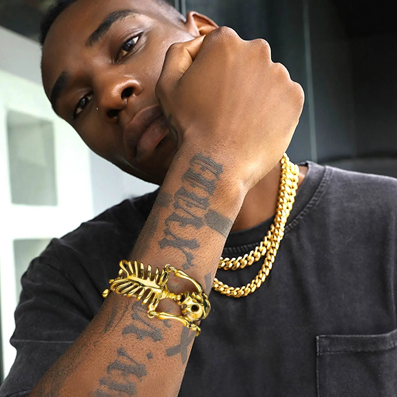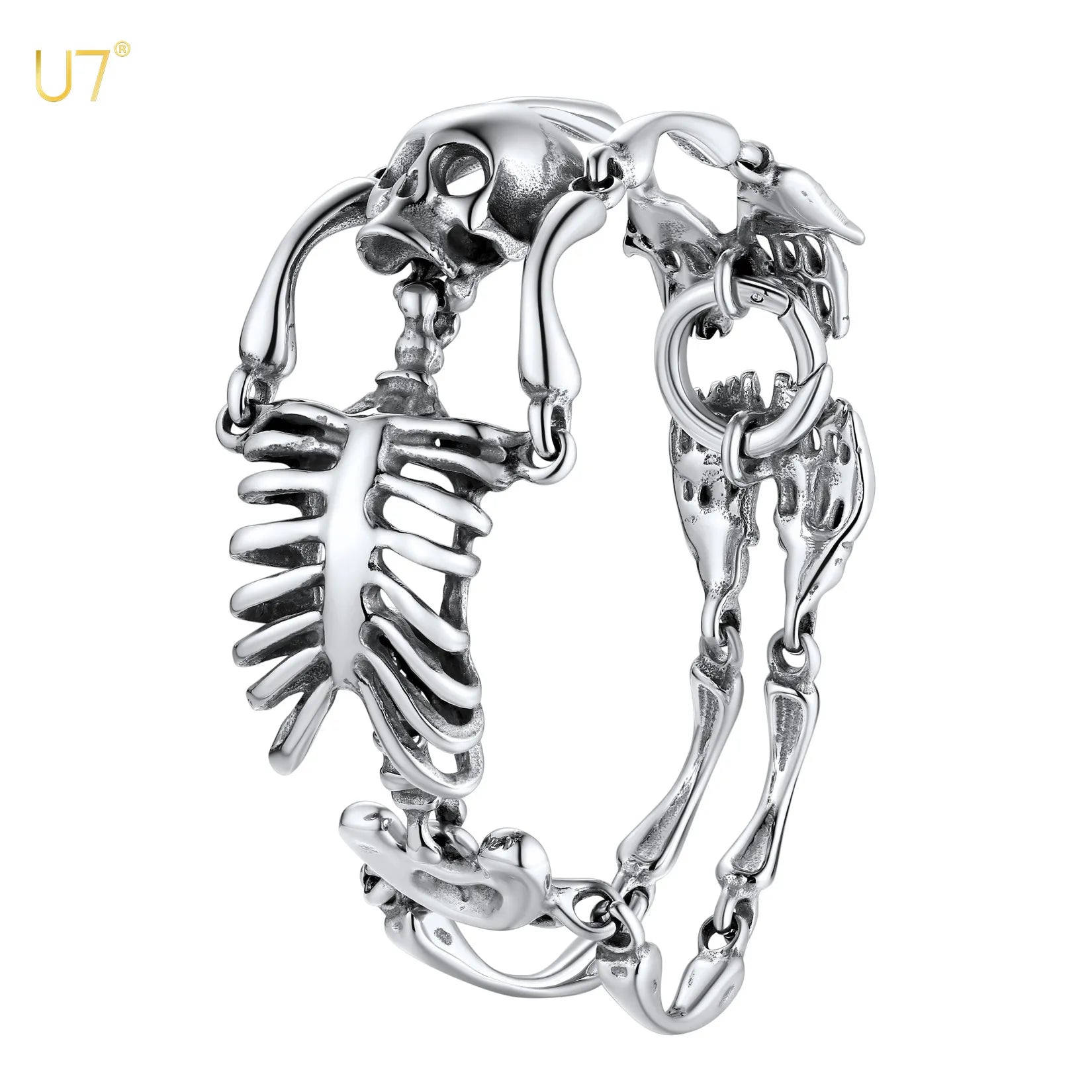 U7 Stainless Steel Gothic Skull Bracelet for Men Steampunk Heavy Skeleton Wristband Chains Halloween Party Accessories