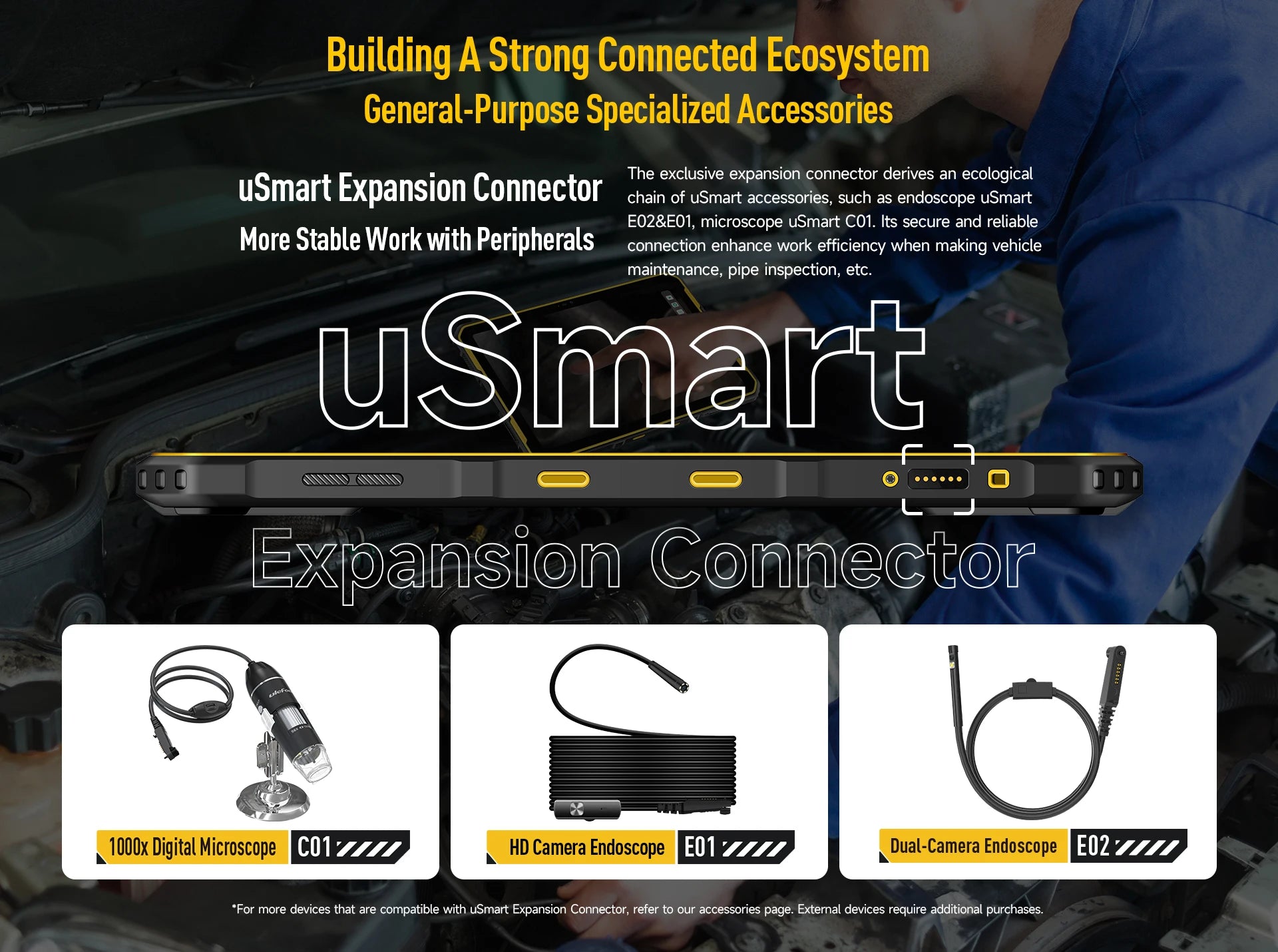 The exclusive expansion connector derives an ecological chain of uSmart accessories, such as endoscope uSmart E02&E01, microscope uSmart C01. Its secure and reliable connection enhance work efficiency when making vehicle maintenance, pipe inspection, etc.