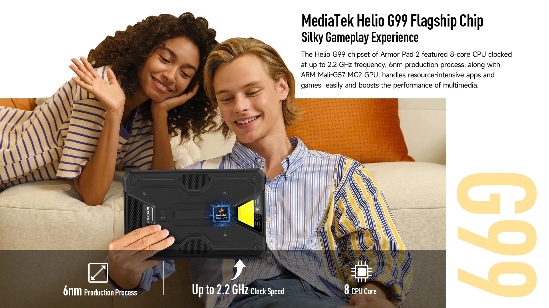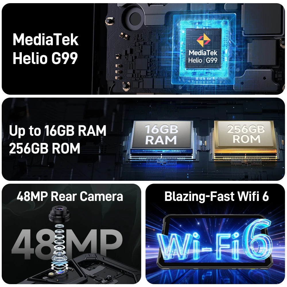 The Helio G99 chipset of Armor Pad 2 featured 8-core CPU clocked at up to 2.2 GHz frequency, 6nm production process, along with ARM Mali-G57 MC2 GPU, handles resource-intensive apps and games easily and boosts the performance of multimedia.