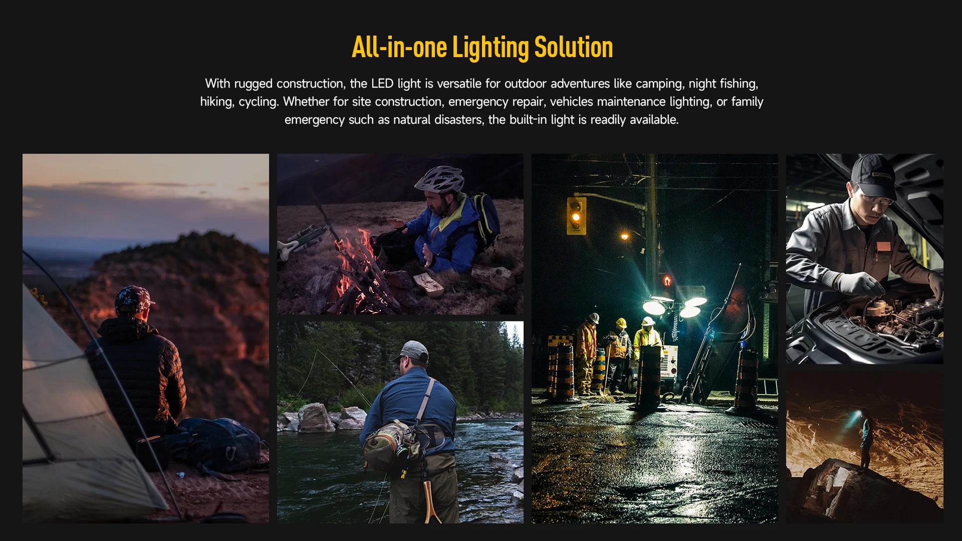 With rugged construction, the LED light is versatile for outdoor adventures like camping, night fishing, hiking, cycling. Whether for site construction, emergency repair, vehicles maintenance lighting, or family emergency such as natural disasters, the built-in light is readily available.