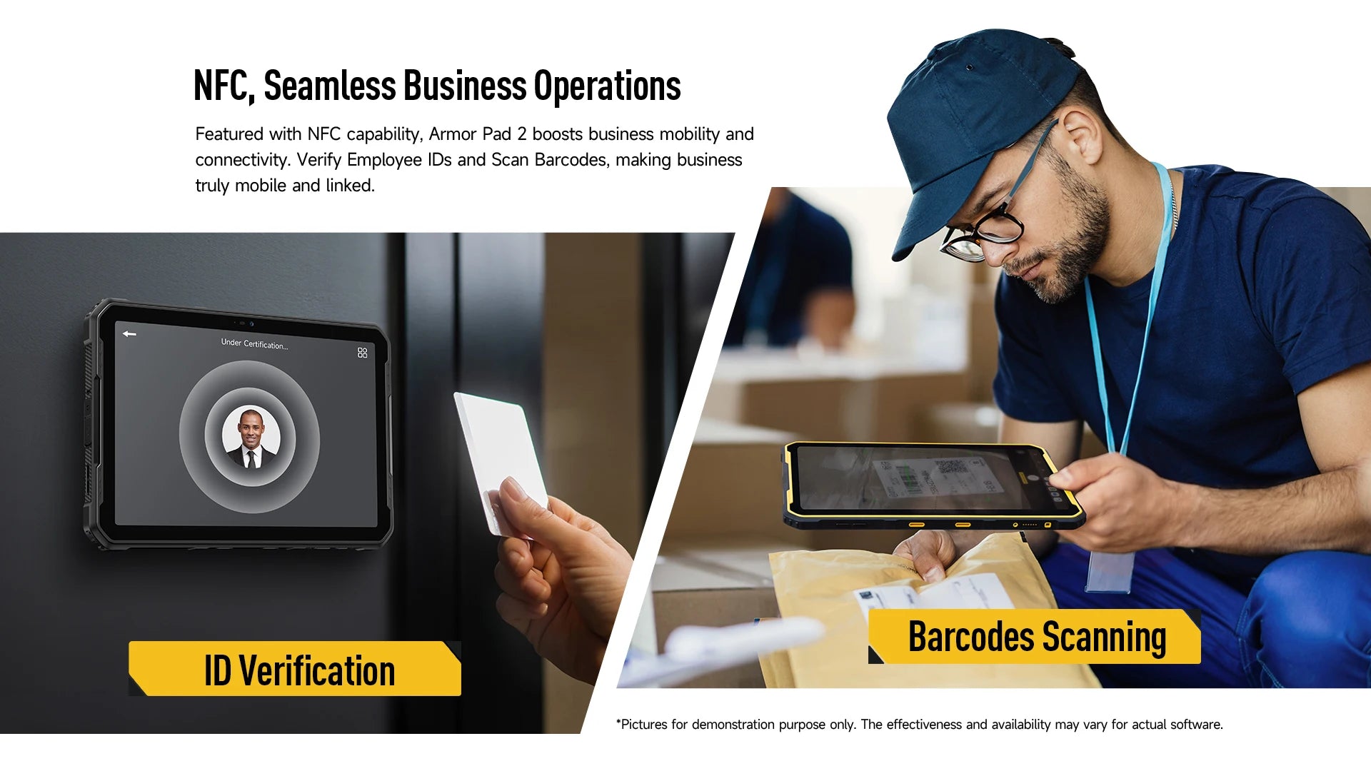 Featured with NFC capability, Armor Pad 2 boosts business mobility and connectivity. Verify Employee IDs and Scan Barcodes, making business truly mobile and linked.