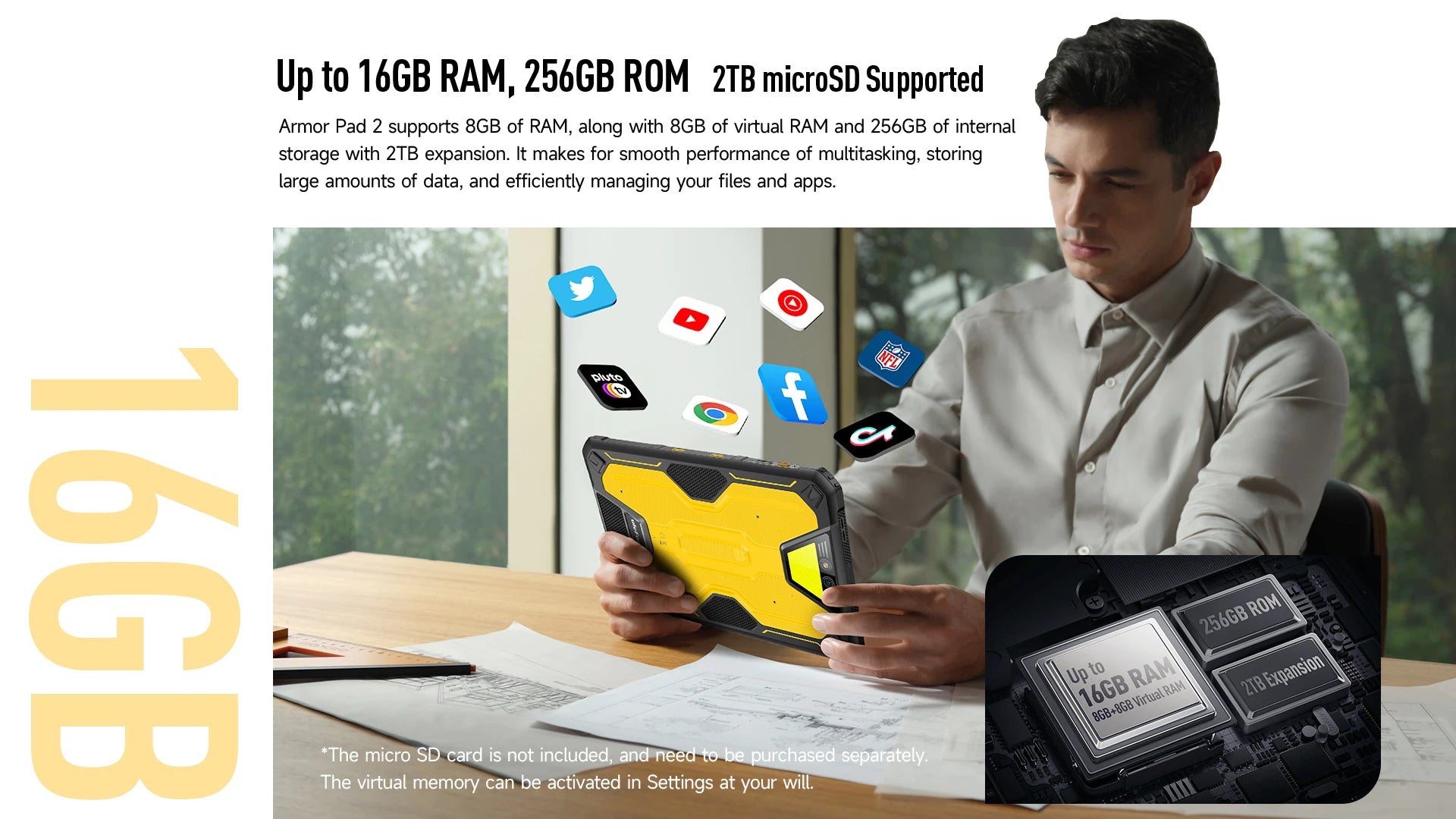 Armor Pad 2 supports 8GB of RAM, along with 8GB of virtual RAM and 256GB of internal storage with 2TB expansion. It makes for smooth performance of multitasking, storing large amounts of data, and efficiently managing your files and apps.