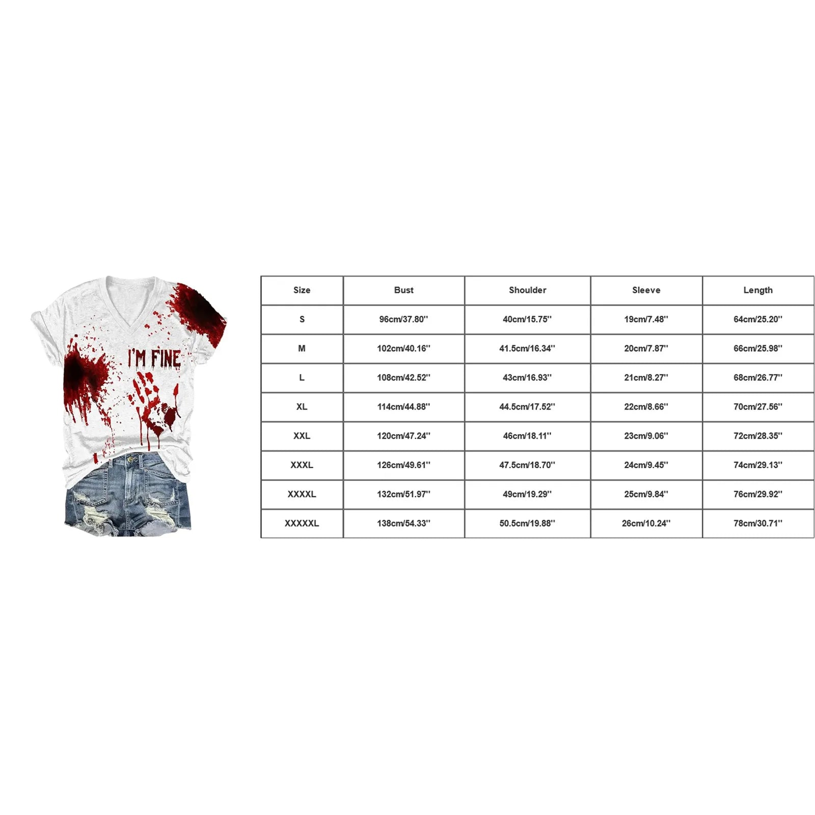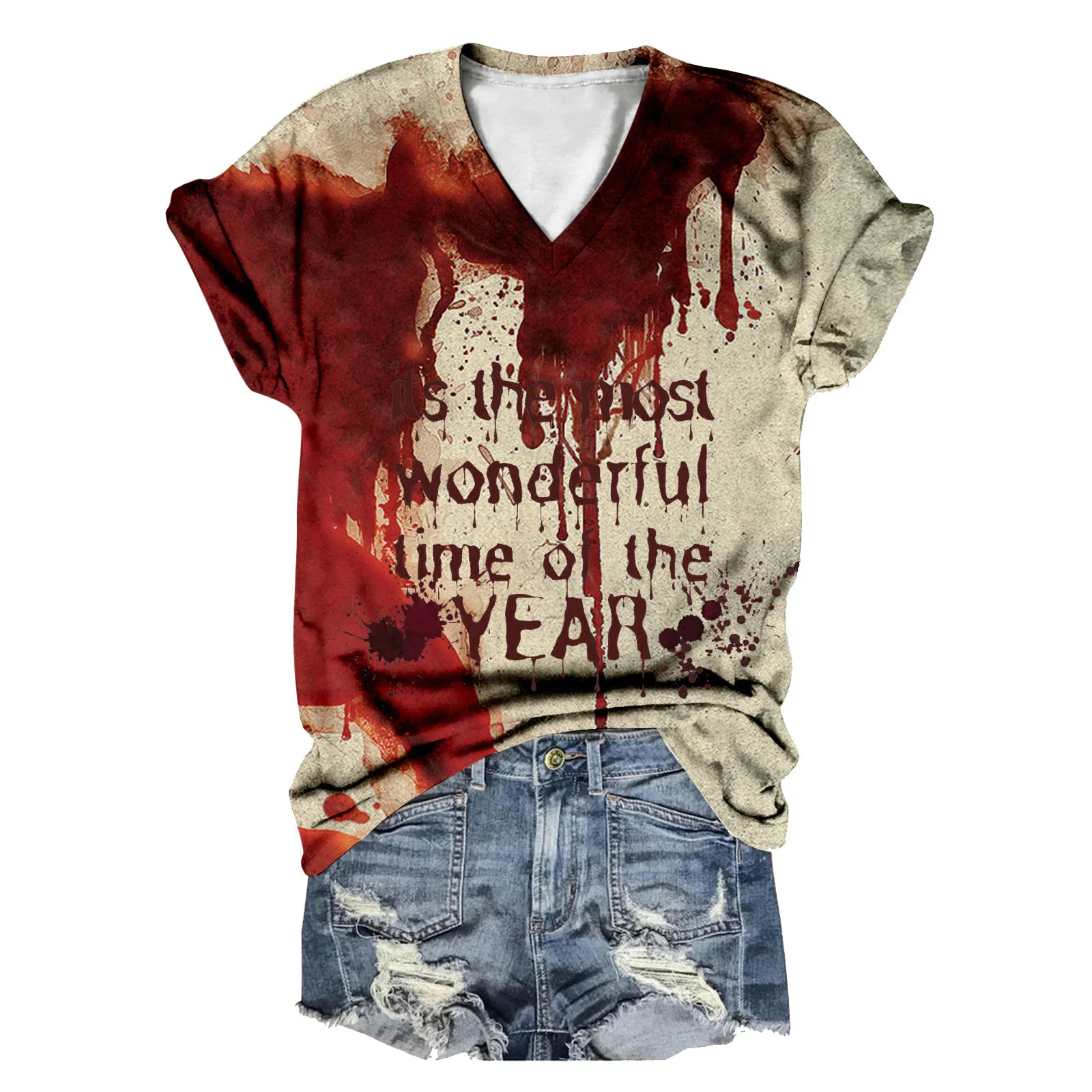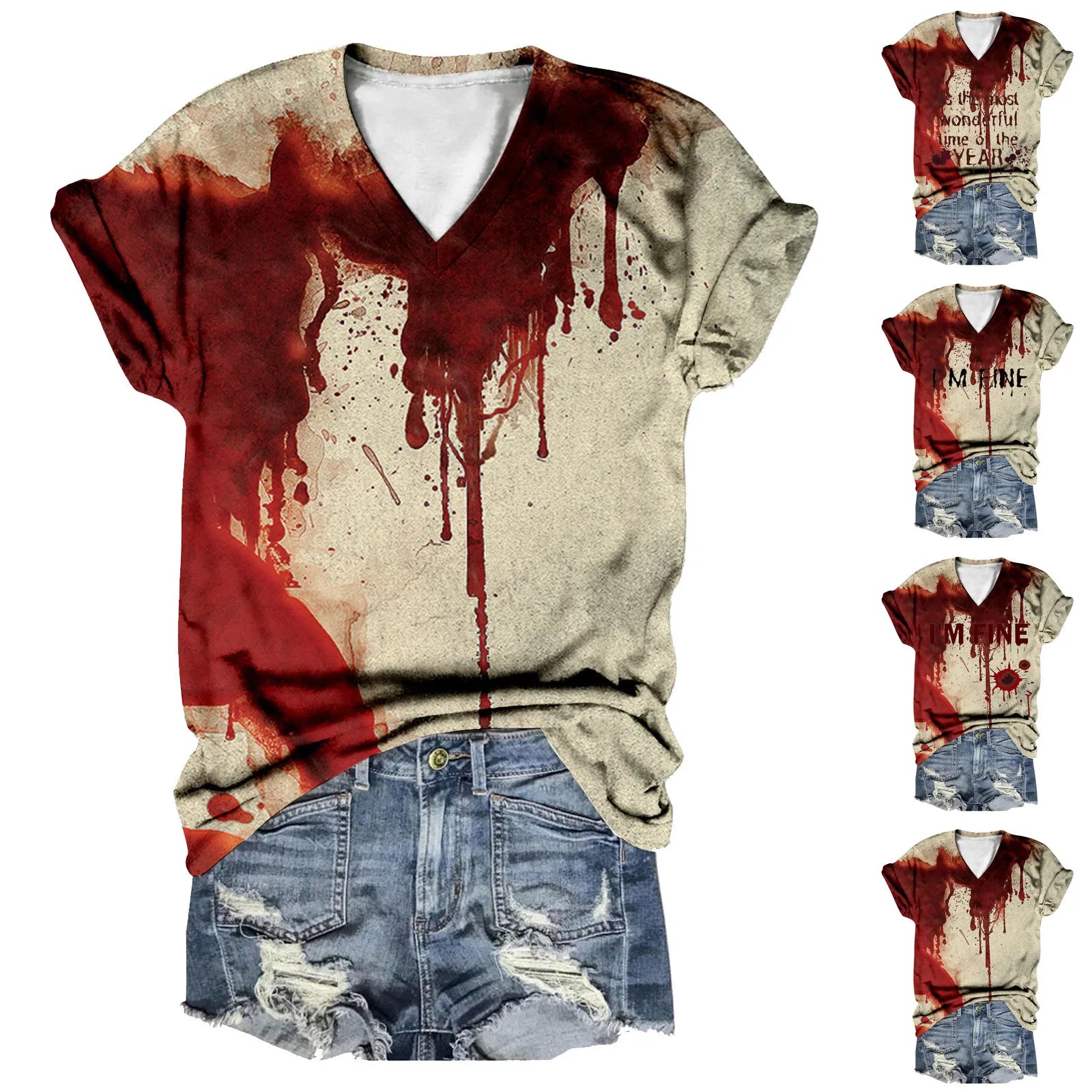 Women'S Casual V Neck Short Sleeved Halloween Bloody Letter Printed T Shirt European And American Women'S Fashionable T Shirts