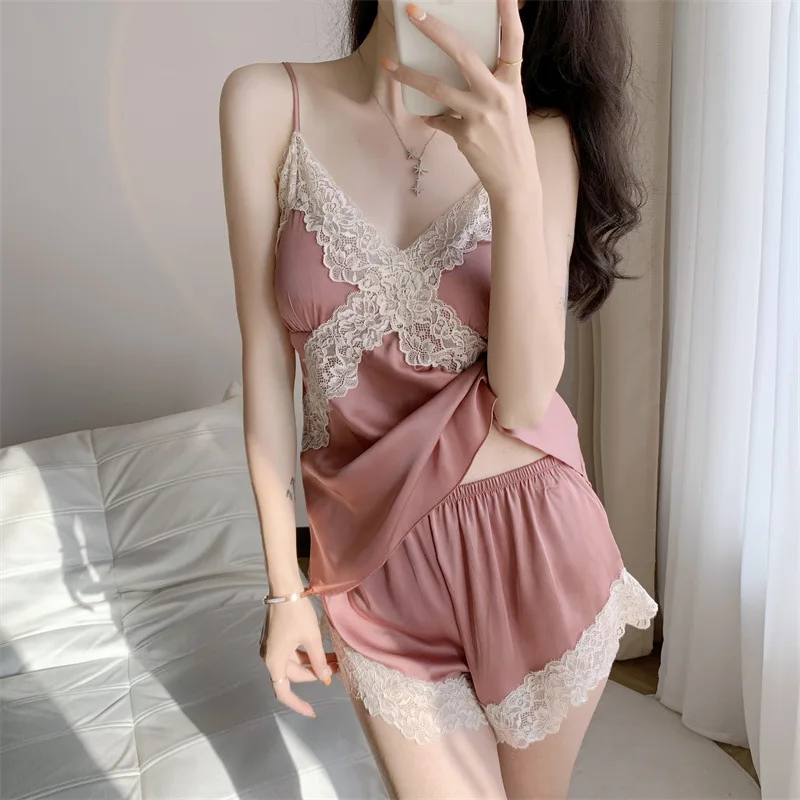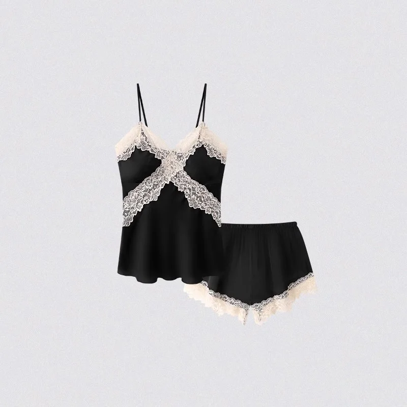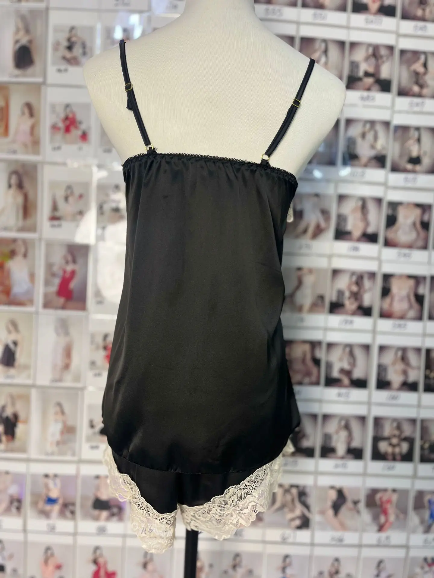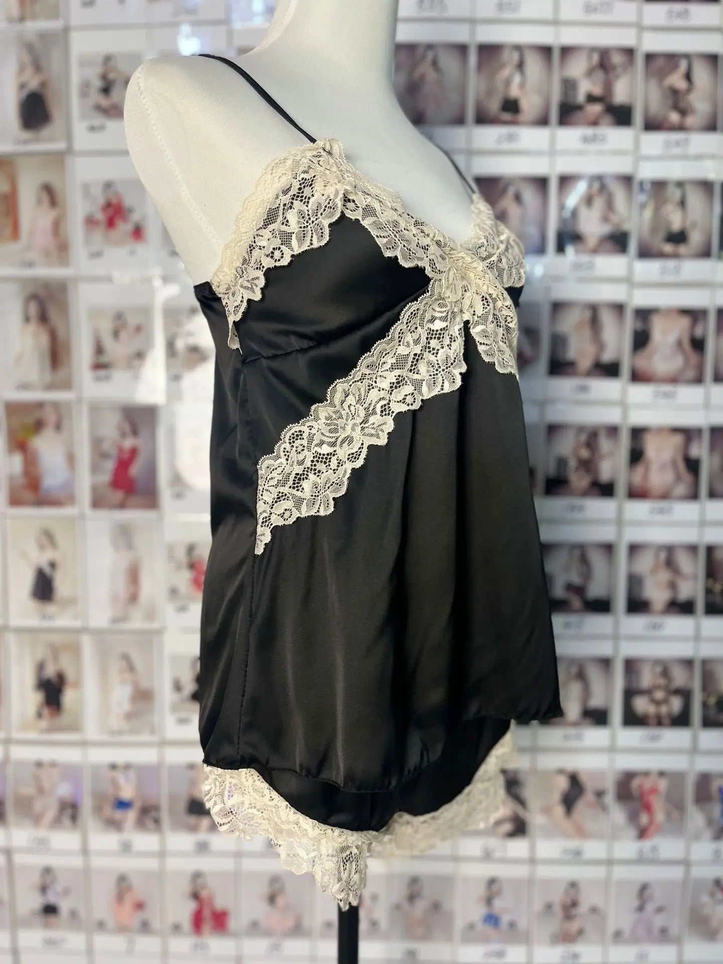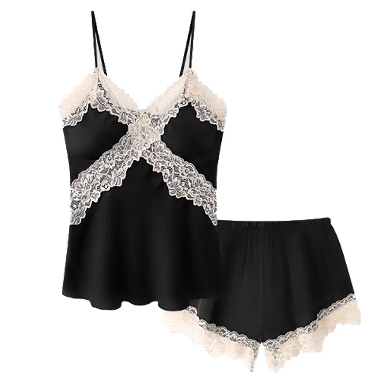 Womens Sexy Satin Pajama Set Lace Trim Cami Top Shorts Lingerie Sleepwear Silky Black Cream V Neck Spaghetti Strap Two Piece