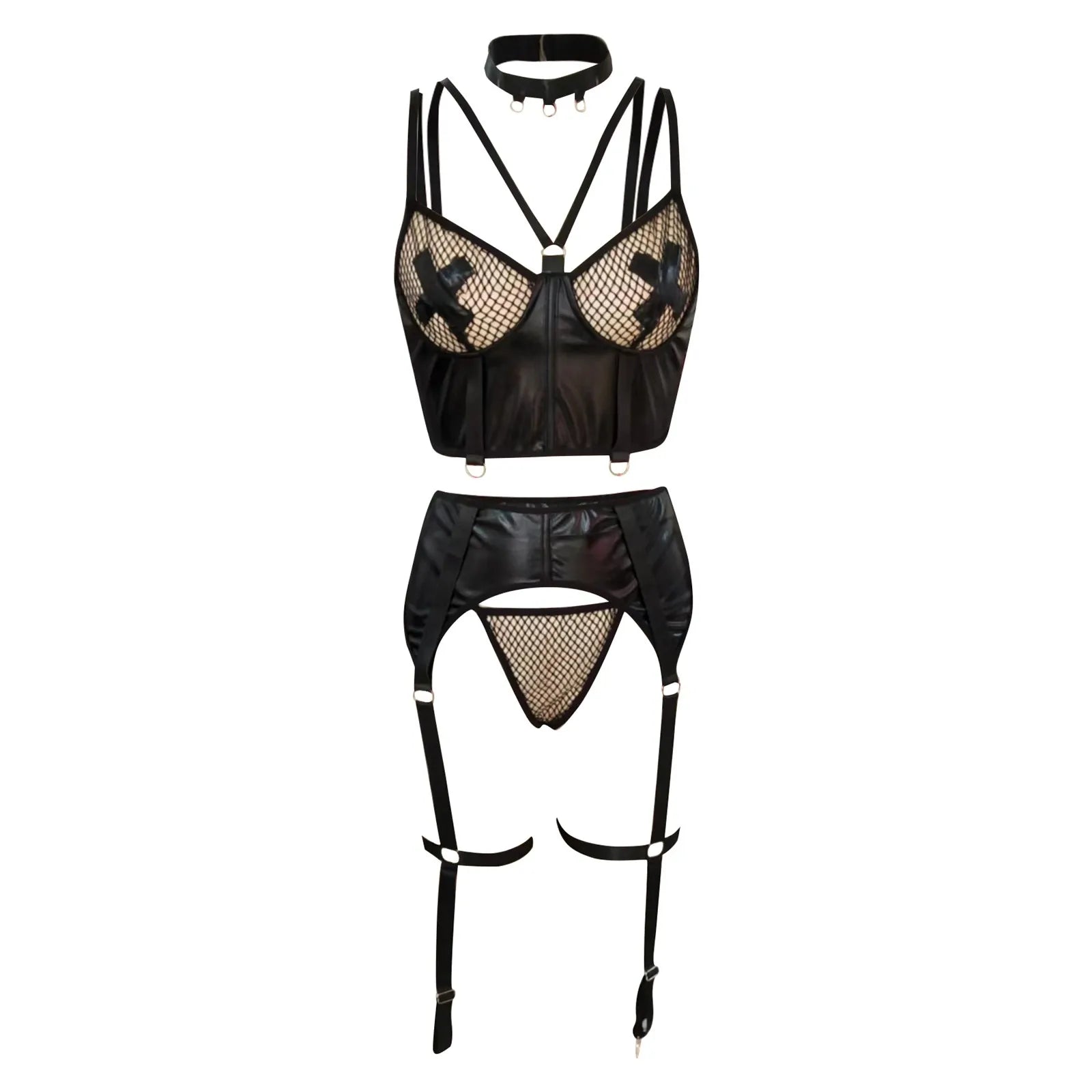Women'S Sexy Sheer Mesh Leather Lingerie Set Seductive Thin Metal Buckle Underwear Set Costumes For Plus Size Woman Clothing